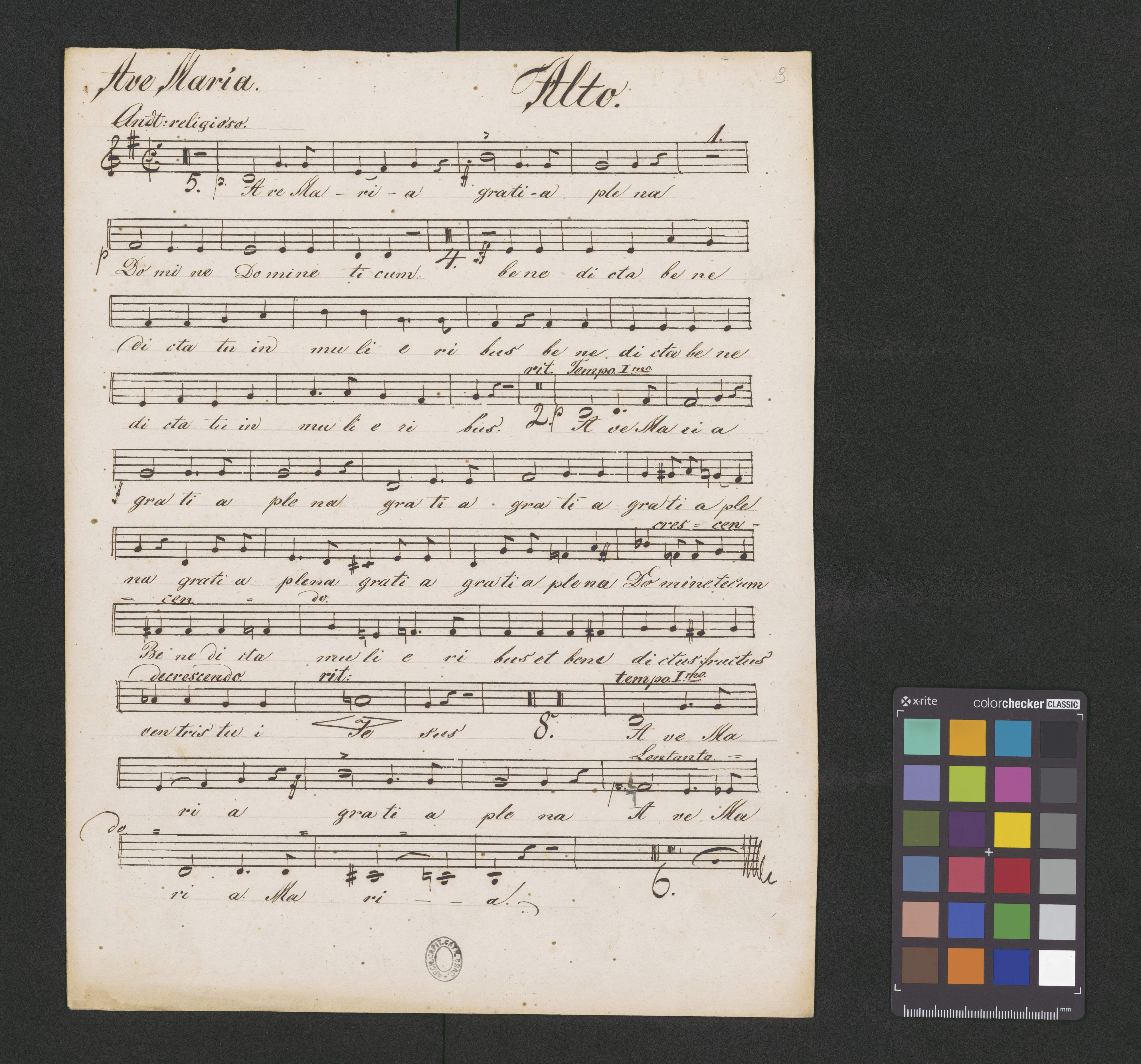 [title page:] Ave Maria! | (Graduale) | Quatuor vocibus cantatum, concinentibus duobus Violinis, | Viola, Cello, Flauto, duobus Clarinettis, duobus Cornobus, | Basso et Organo. | compositum et summa cum devotione dedicatum | Praealtis Honoribus | Reverendissimi, Perillustris, Ampolissime ac Doctissimi Domini Domini Comitis | Alphonso Skorkoeski | Canonici ad Cd CAthedralem Cracoviae etc. etc. | ab | Vincentio Vinař | ad Basilicam Zagrabiensem organista