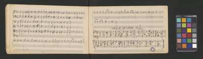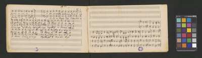 [pl-text: Źródło w formie książeczki/małego zeszytu z partyturami (zapis fortepianowy, cztery głosy na dwóch pięcioliniach) Prawdopodobnie przeznaczona do użytku dyrygenta lub organisty.], [pl-text: Foliacja w źródle naniesiona ołówkiem.], [pl-text: W prawym górnym rogu okładki dopisany atramentem numer "1". Na odwrocie okładki obliczenia zapisane ołówkiem w słupku.], [pl-text: Na okładce (powyżej tytułu) papierowa naklejka z zapisaną ołówkiem sygnaturą.], [pl-text: W partyturach poprawki/dopiski sporządzone ołówkiem. Jedna z partytur w całości zapisana ołówkiem (być może w ramach brudnopisu).], [pl-text: W niektórych partyturach brak dopisanego tekstu słownego; jedna z partytur niekompletna.], [pl-text: Pieczęć: „CATH. CRAC. * ARCH. CAPIT.” (niebieska) na wewnętrznej stronie okładki oraz na każdym folio na stronie recto; czerwona na f. 2r, 3r; Pieczęć: „ARCHIWUM I BIBLIOTEKA”, „Krakowskiej Kapituły Katedralnej” z sygnaturą wpisaną ołówkiem na odwrocie k. tytułowej (wewnątrz okładki); Owalna niebieska pieczęć "DYREKCJA C.K. GIMNAZJUM Św. ANNY * W KRAKOWIE" z herbem z dwugłowym orłem w polu na okładce w prawym górnym rogu.]