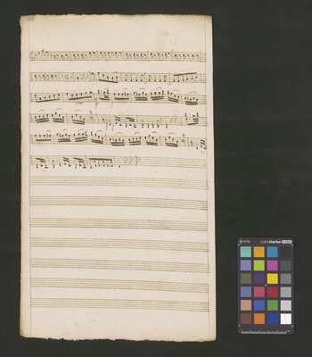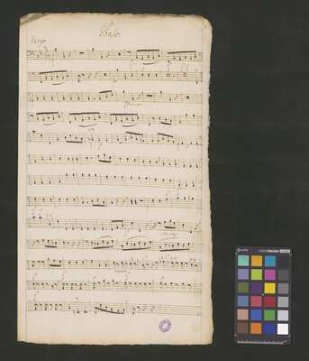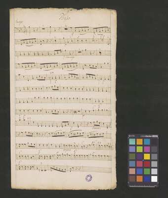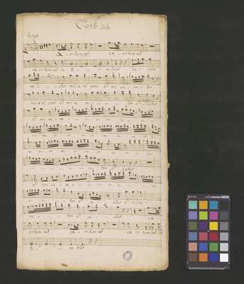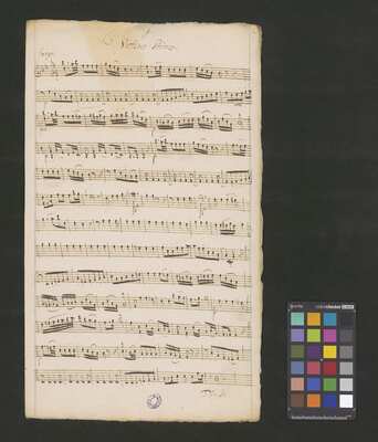 [pl-text: Karty obłożone okładką z mocniejszego papieru. Tytuł na okładce spisany inną ręką niż głosy w źródle.], [pl-text: Foliacja w źródle naniesiona ołówkiem.], [pl-text: Dodatkowe egzemplarze partii vl 1, 2 i b spisane tą samą ręką co pozostałe głosy.], [pl-text: Karta z głosem vla podpisana jako "Viole"; w partii w niektórych taktach zapisany dwugłos.], [pl-text: Pieczęć: „ARCHIWUM I BIBLIOTEKA”, „Krakowskiej Kapituły Katedralnej” wraz z sygnaturą wpisaną ołówkiem na jednej z wewnętrznych stron okładki; niebieska pieczęć: „CATH. CRAC. * ARCH. CAPIT.” na każdym folio na stronie recto; czerwona na wewnętrznej stronie okładki.]