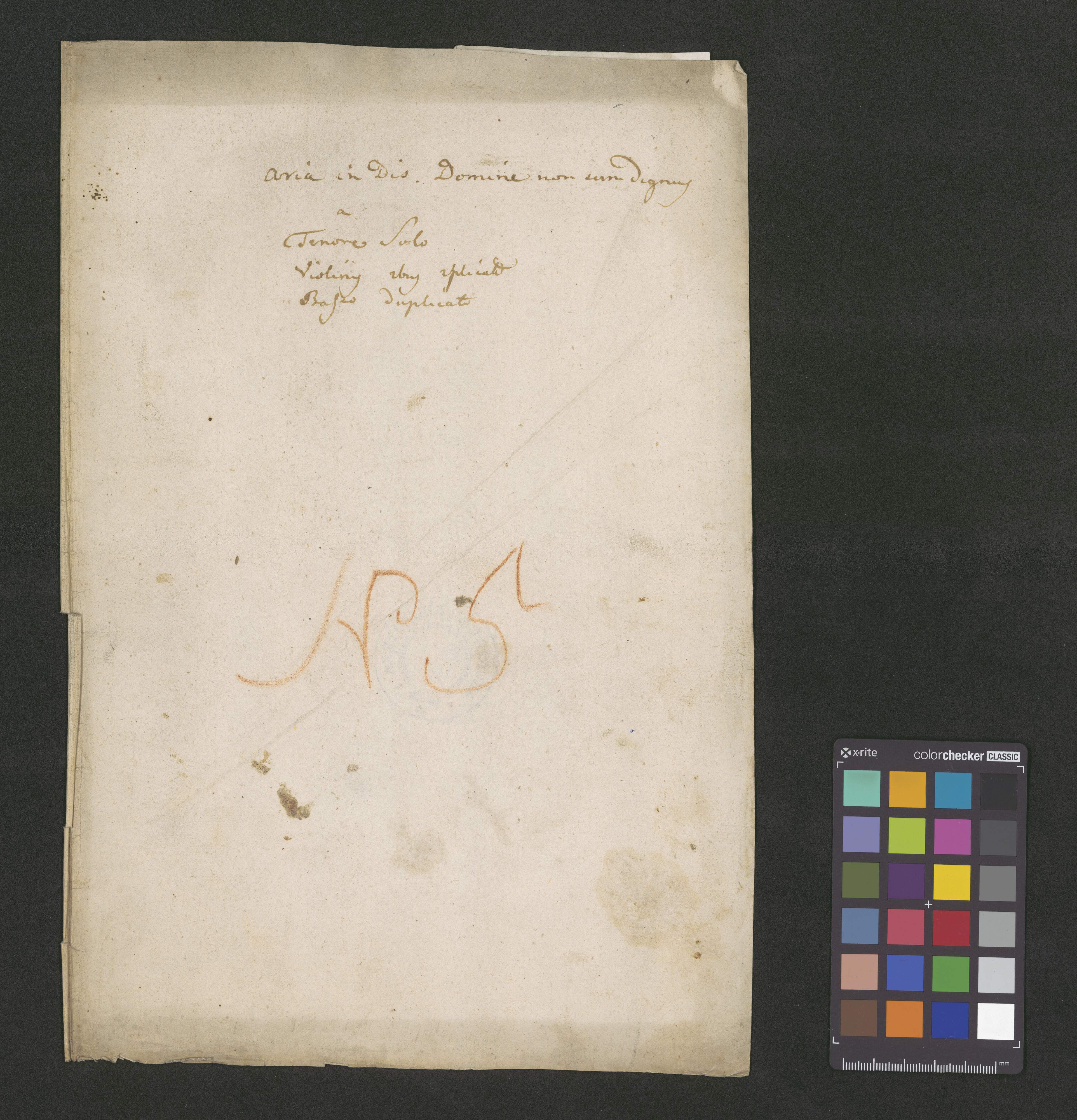 [cover page:] Aria in Dis. Domine non sum dignus | a | Tenore Solo | Violinis 2bus duplicat | Basso duplicat