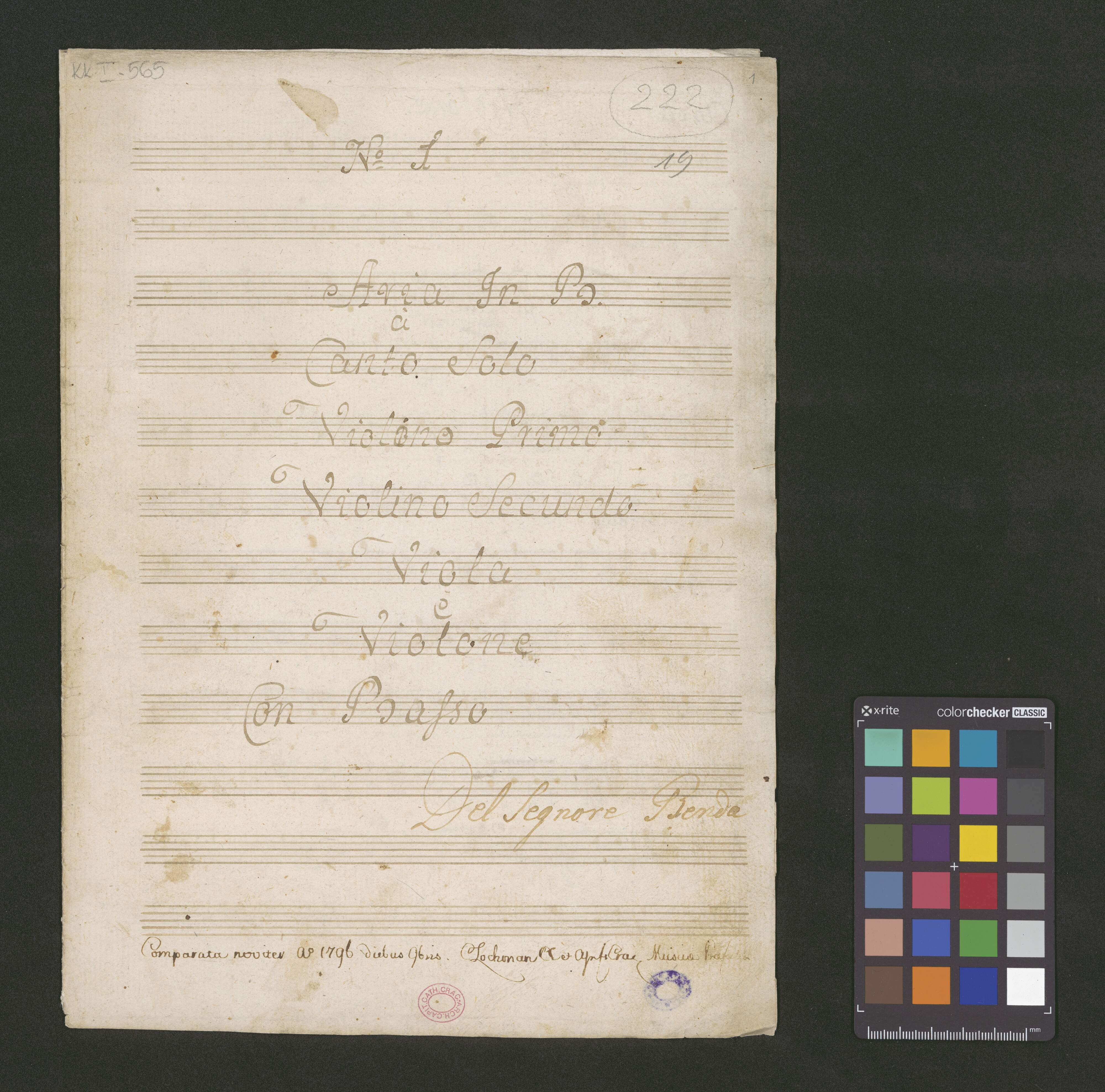 [title page:] N|o| 1 | Aria in B. | a | Canto Solo | Violino Primo | Violino Secundo | Viola | e | Violone. | Con Basso | Del Segnore Benda | Comparata noviter A|o| 1796 diebus Orbis. Lochman A et [illegible] Crac. Musica Praf [further smudged]