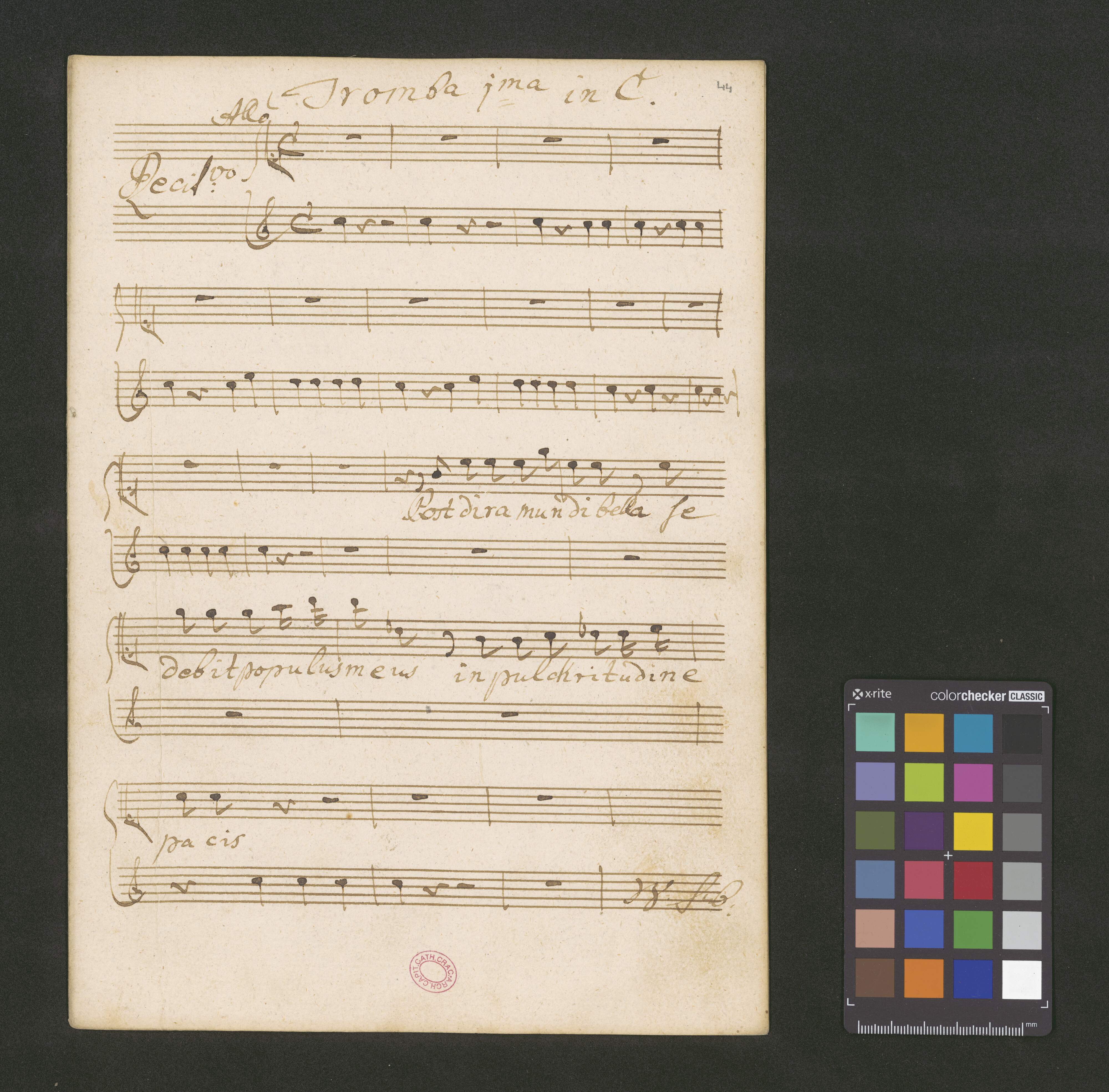 [title page:] Aria | a | 4 voci | Soprano Conc|t|o| | Alto | Tenore | Basso } Rip|n|o| | 2 Violino | 2 Oboe | 2 Trombi | Tympano | Organo con Violone | Del Sig|r|e Floriano Gasmann