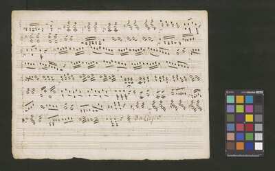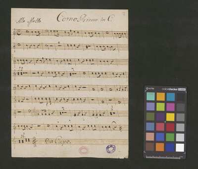 [pl-text: Partie cor 1 i cor 2 zapisane na kartach o innych wymiarach: 22 x 17 cm.], [pl-text: Na 2r nagłówek "Soprano solo in C. Del Segniore Fiore di Late".], [pl-text: Foliacja w źródle naniesiona ołówkiem.], [pl-text: Pieczęć okrągła o treści "ARCHIWUM I BIBLIOTEKA | Krakowskiej Kapituły Katedralnej | Kk.I. | 573" na 1r.], [pl-text: Mała, czerwona, owalna pieczęć o treści "CATH. CRAC. * ARCH. CAPIT." oraz mała, niebieska, owalna pieczęć o treści "CATH. CRAC. * ARCH. CAPIT." na 2r, 3r, 4r, 5r, 6r, 7r, 8v, 9r.]