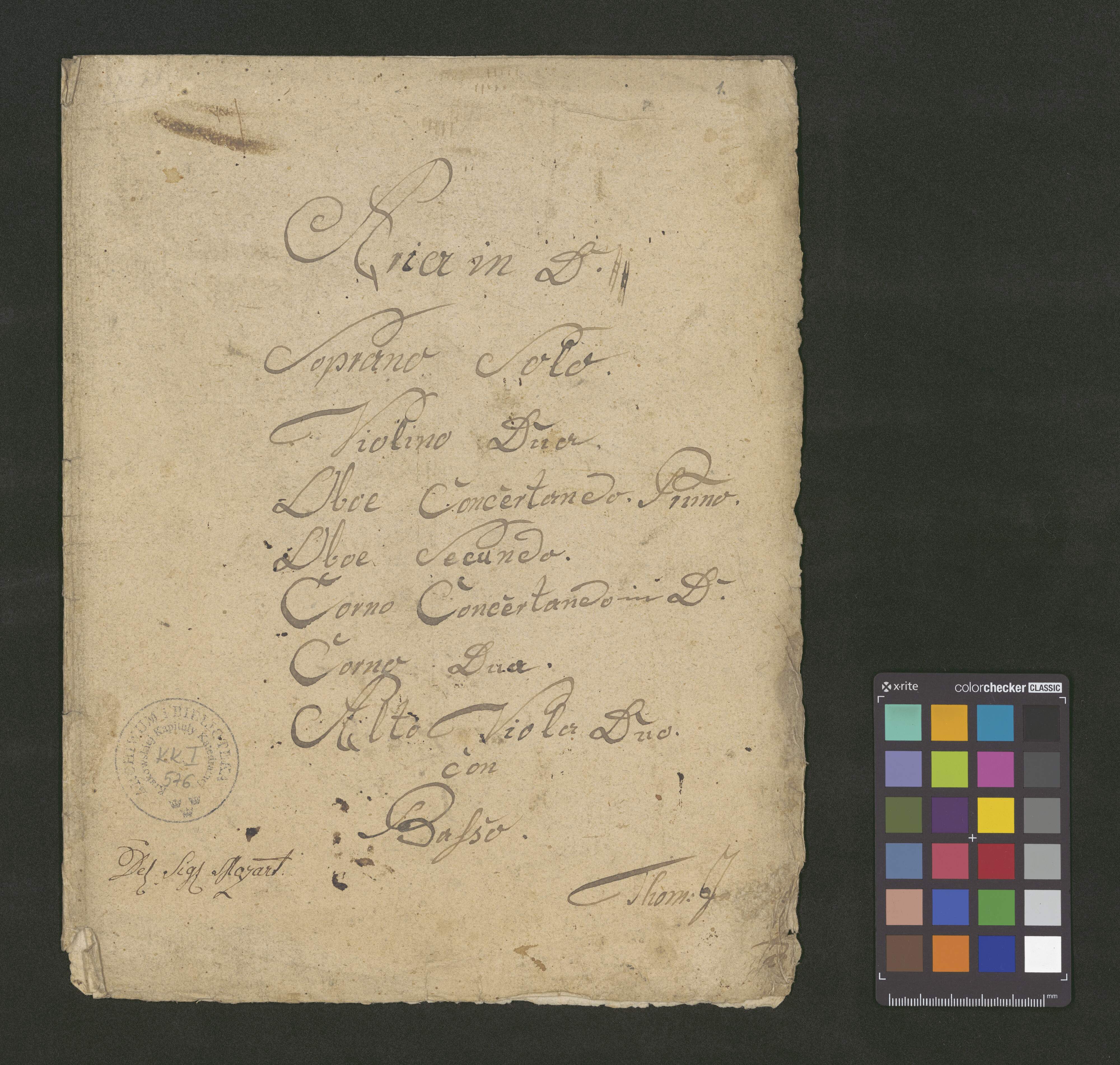 Aria in D. | Soprano Solo. | Violini Due. | Oboe Concertando. Primo. | Oboe Secundo. | Corno Concertando in D. | Cornu Due. | Alto Viola Duo. | con | Basso. | Del Sigl Mozart. | Thom: J