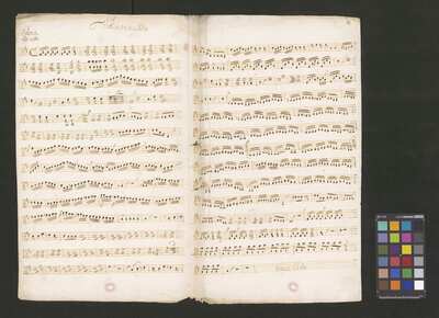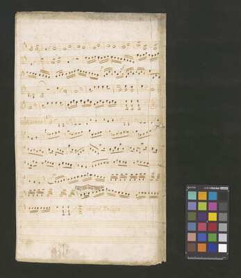 [pl-text: Na pierwszej stronie okładki zapisany pomarańczową kredką duży numer "N. 6".], [pl-text: Foliacja w źródle naniesiona ołówkiem.], [pl-text: Na końcu partii S solo rozpisana kadencja.], [pl-text: Pieczęć okrągła o treści "ARCHIWUM I BIBLIOTEKA | Krakowskiej Kapituły Katedralnej | Kk.I. | 586" na 2r.], [pl-text: Mała, czerwona, owalna pieczęć o treści "CATH. CRAC. * ARCH. CAPIT." na 1v oraz na stronach recto kart 3-15.]