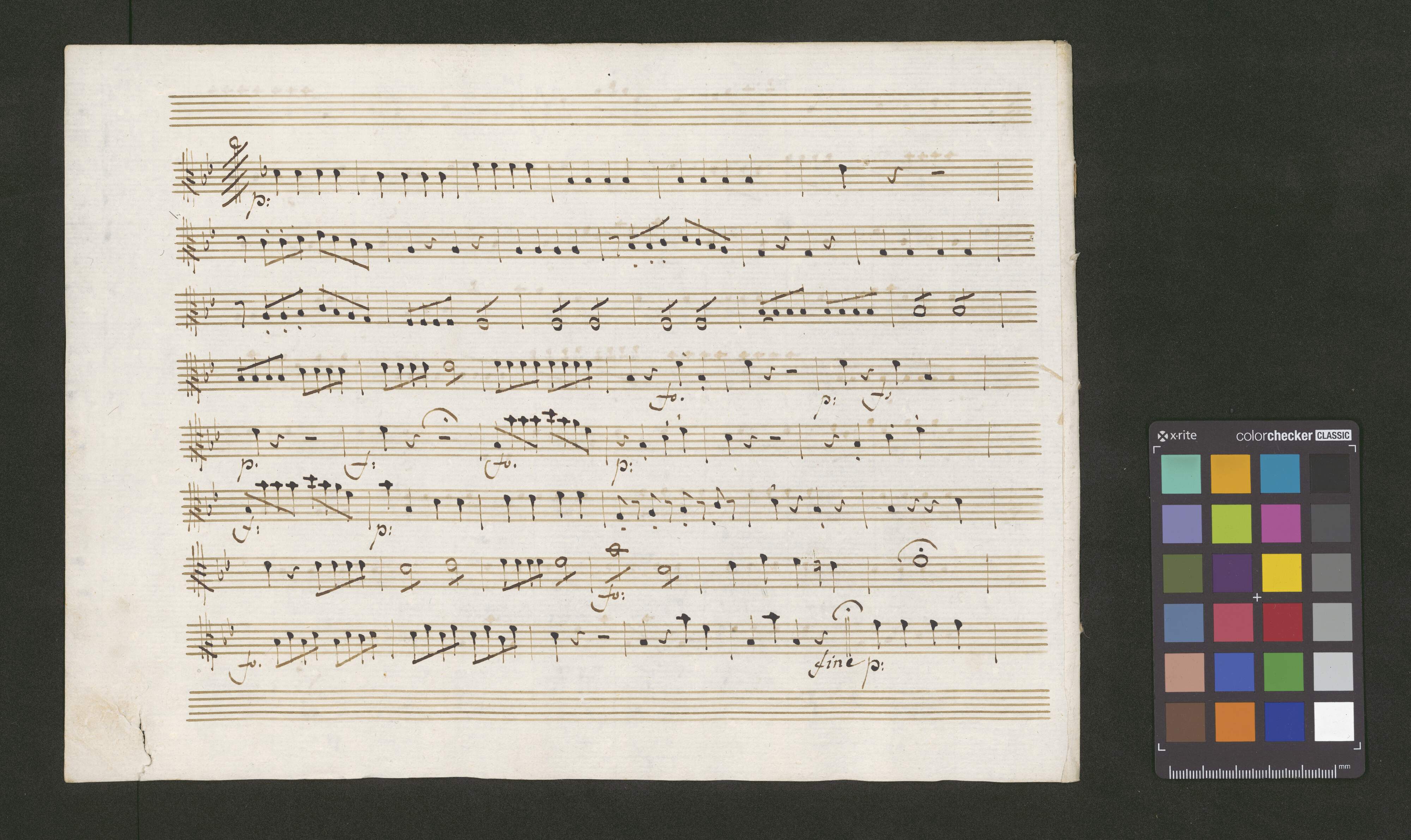 [on S and b:] Basso fondamento. | Aria in B. a Canto Solo | Violini Due | Canto Solo. [space] Oboe Due | Corni Due | Viola Obligato | et Basso | del S|r|e Tomaso Traeta