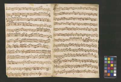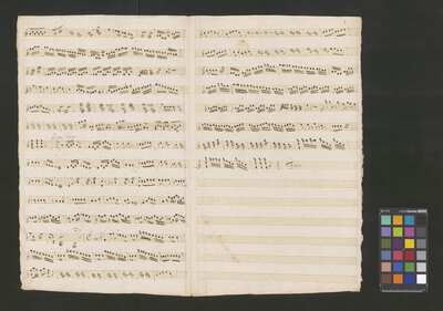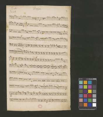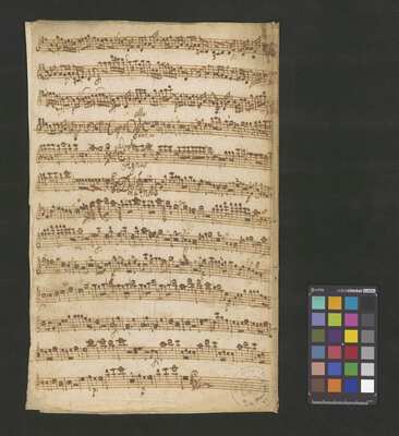 [pl-text: Okładka (karty nr 1 i 14) sporządzona z partii vl 1 niezidentyfikowanej mszy.], [pl-text: Partie instrumentów dętych sporządzone na kartach o wymiarach 24 x 21.5 cm.], [pl-text: Na stronach verso kart 8-13 zanotowano wykreślone fragmenty niezidentyfikowanych kompozycji (na 8v podpisane jako cor 1, na 9v jako fl 2).], [pl-text: Na 1r zapisany pomarańczową kredką duży numer "N. 3".], [pl-text: Foliacja w źródle naniesiona ołówkiem.], [pl-text: Pieczęć okrągła o treści "ARCHIWUM I BIBLIOTEKA | Krakowskiej Kapituły Katedralnej | Kk.I. | 599" na 14v (czwartej stronie okładki).], [pl-text: Mała, czerwona, owalna pieczęć o treści "CATH. CRAC. * ARCH. CAPIT." na 1v oraz na stronach recto kart 2-6 i 8-14.]