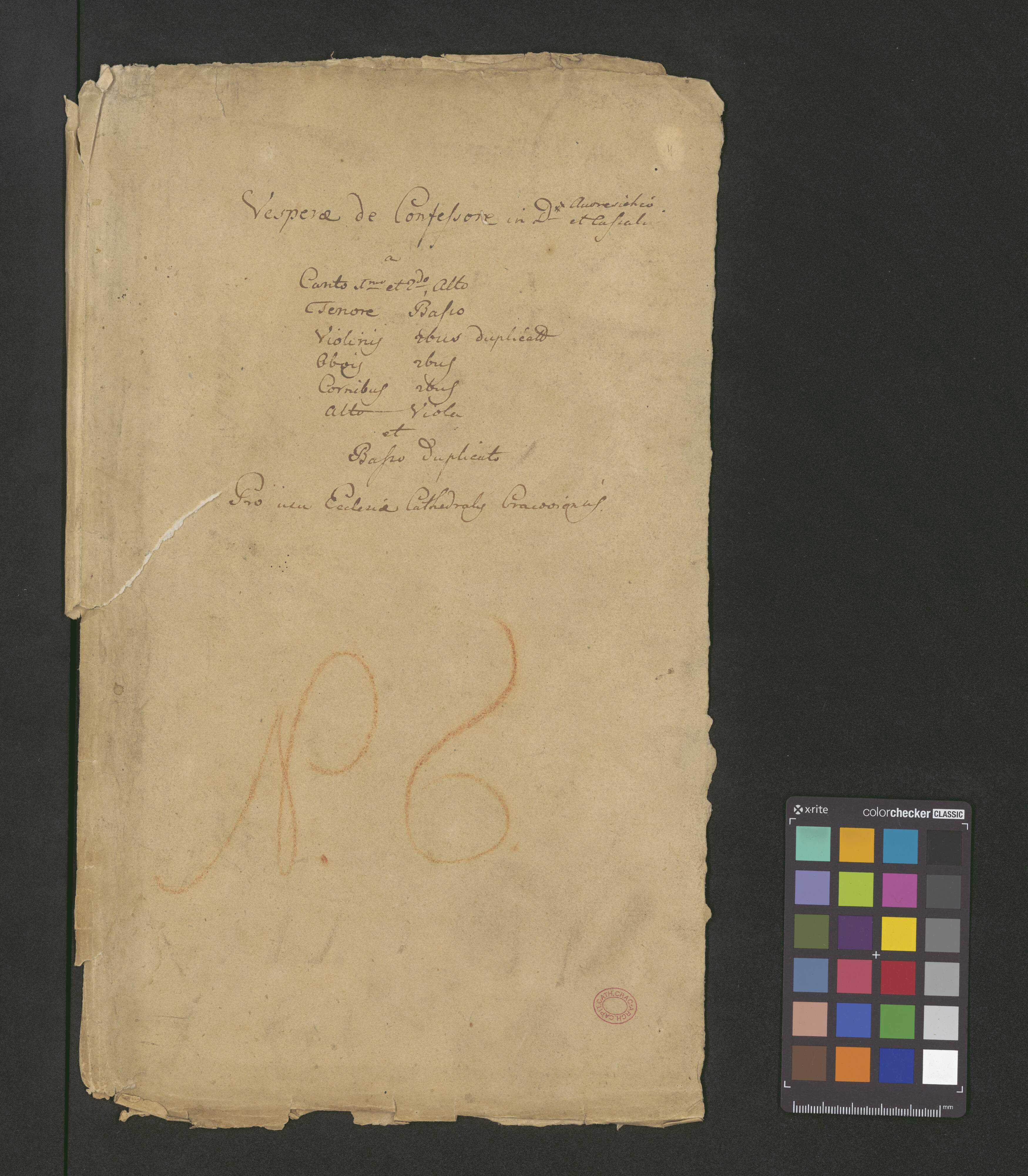 Vesperæ de Confessore in D|♯ | Auresichio | et Cassali | a | Canto 1|m|o et 2|d|o, Alto | Tenore Basso | Violinis 2bus duplicatis | Obois 2bus | Cornibus 2bus | Alto Viola | et | Basso duplicato. | Pro usu Ecclesiæ Cathedralis Cracoviensis