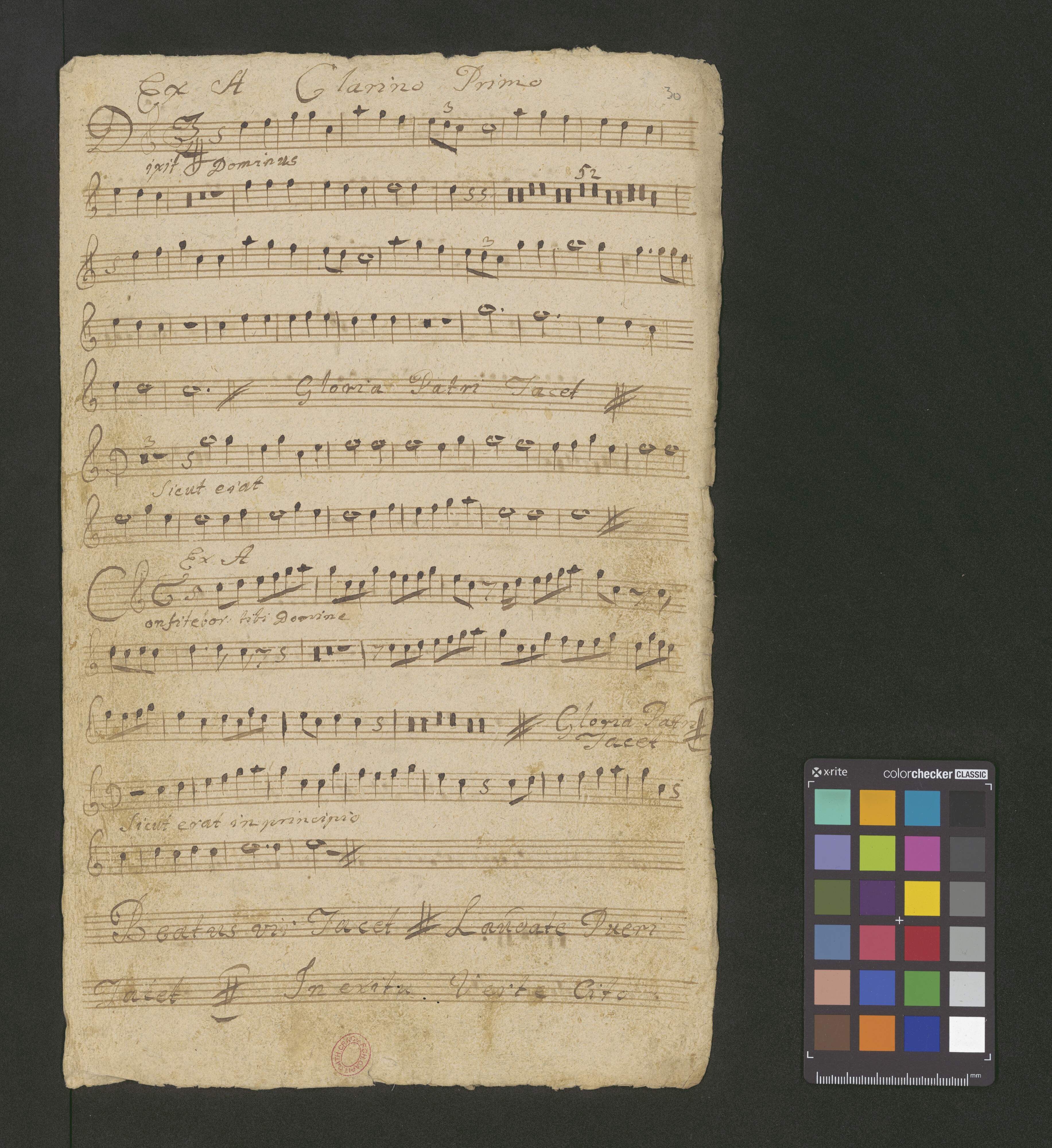 VESPERÆ ex A. | Canto Alto. | Tenore Basso. | Violino Primo. | Violino Secundo. | Clarino Primo. | Clarino Secundo. | Con. | Organo | Ex rebus | Caroli Lisinski | mpp