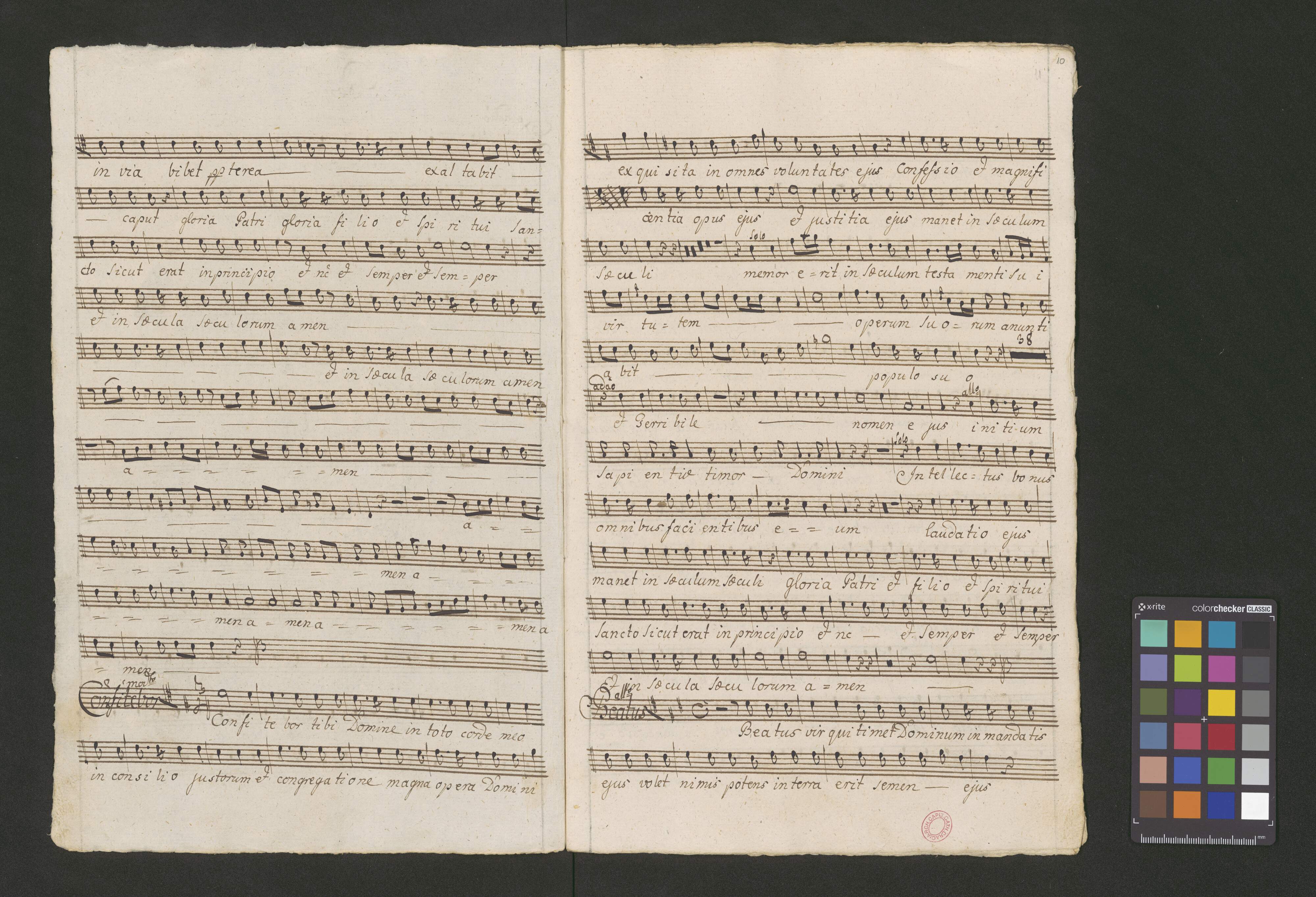 Vesperæ in C | De [crossed out:] Beata [added:] Confessoribus | a | Canto Alto. | Tenore Basso. | Violino Primo duplicato Violino Secundo | Oboa Prima Oboa Secunda | Clarino Primo Clarino Secundo | con | Organo. duplicato. | Del Signore Josepho Majer de Lichtna