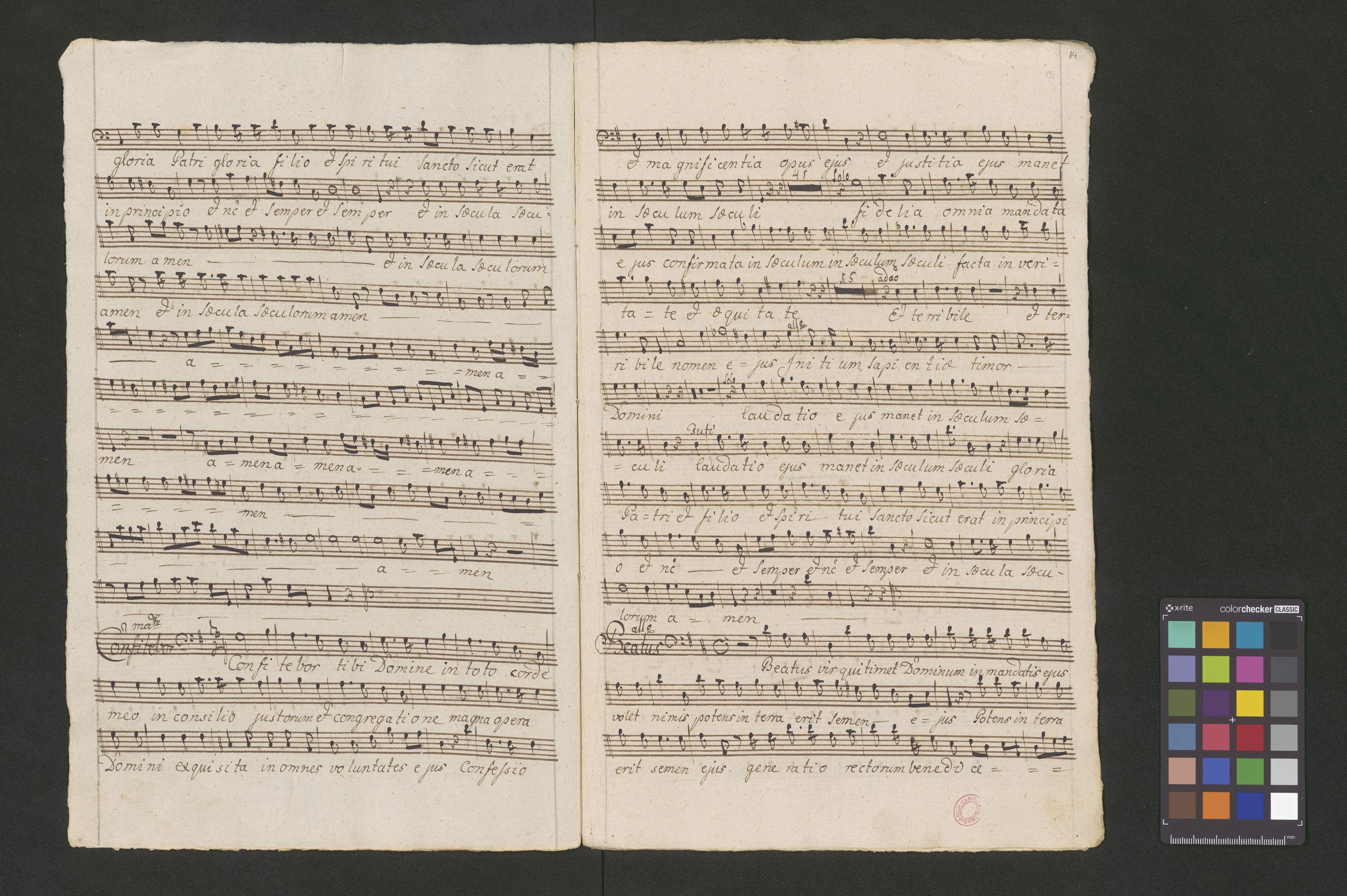 Vesperæ in C | De [crossed out:] Beata [added:] Confessoribus | a | Canto Alto. | Tenore Basso. | Violino Primo duplicato Violino Secundo | Oboa Prima Oboa Secunda | Clarino Primo Clarino Secundo | con | Organo. duplicato. | Del Signore Josepho Majer de Lichtna