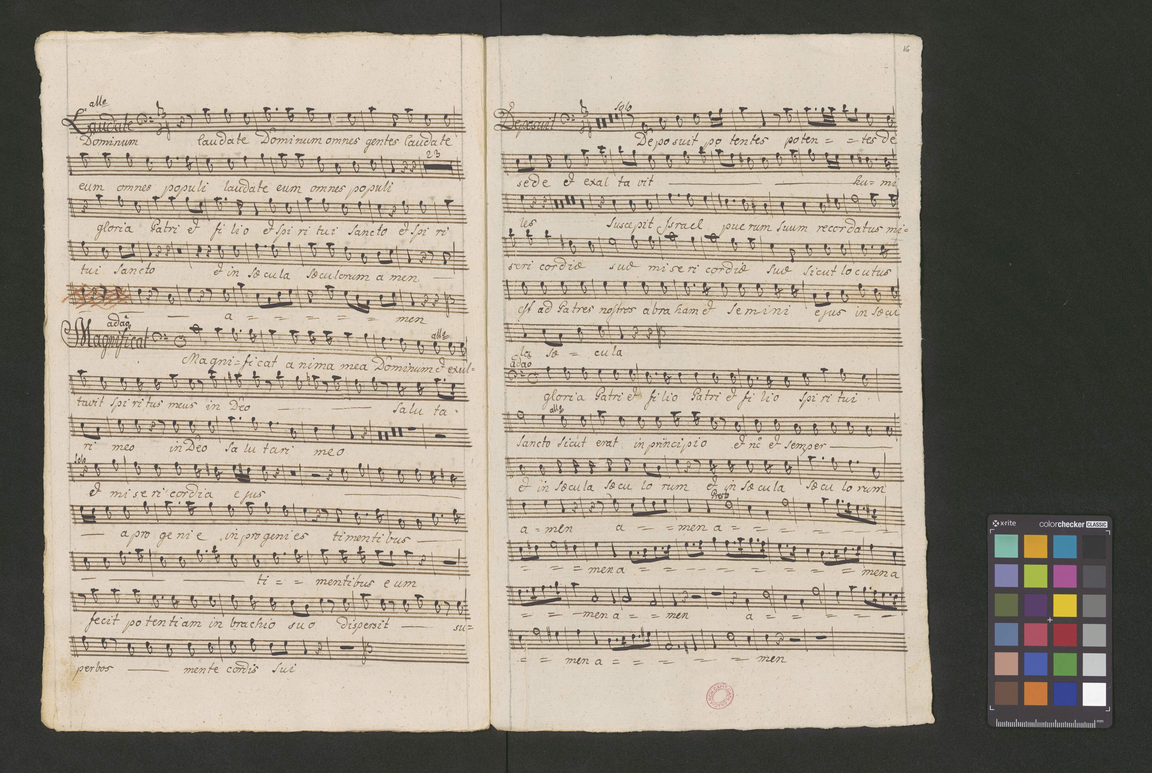 Vesperæ in C | De [crossed out:] Beata [added:] Confessoribus | a | Canto Alto. | Tenore Basso. | Violino Primo duplicato Violino Secundo | Oboa Prima Oboa Secunda | Clarino Primo Clarino Secundo | con | Organo. duplicato. | Del Signore Josepho Majer de Lichtna