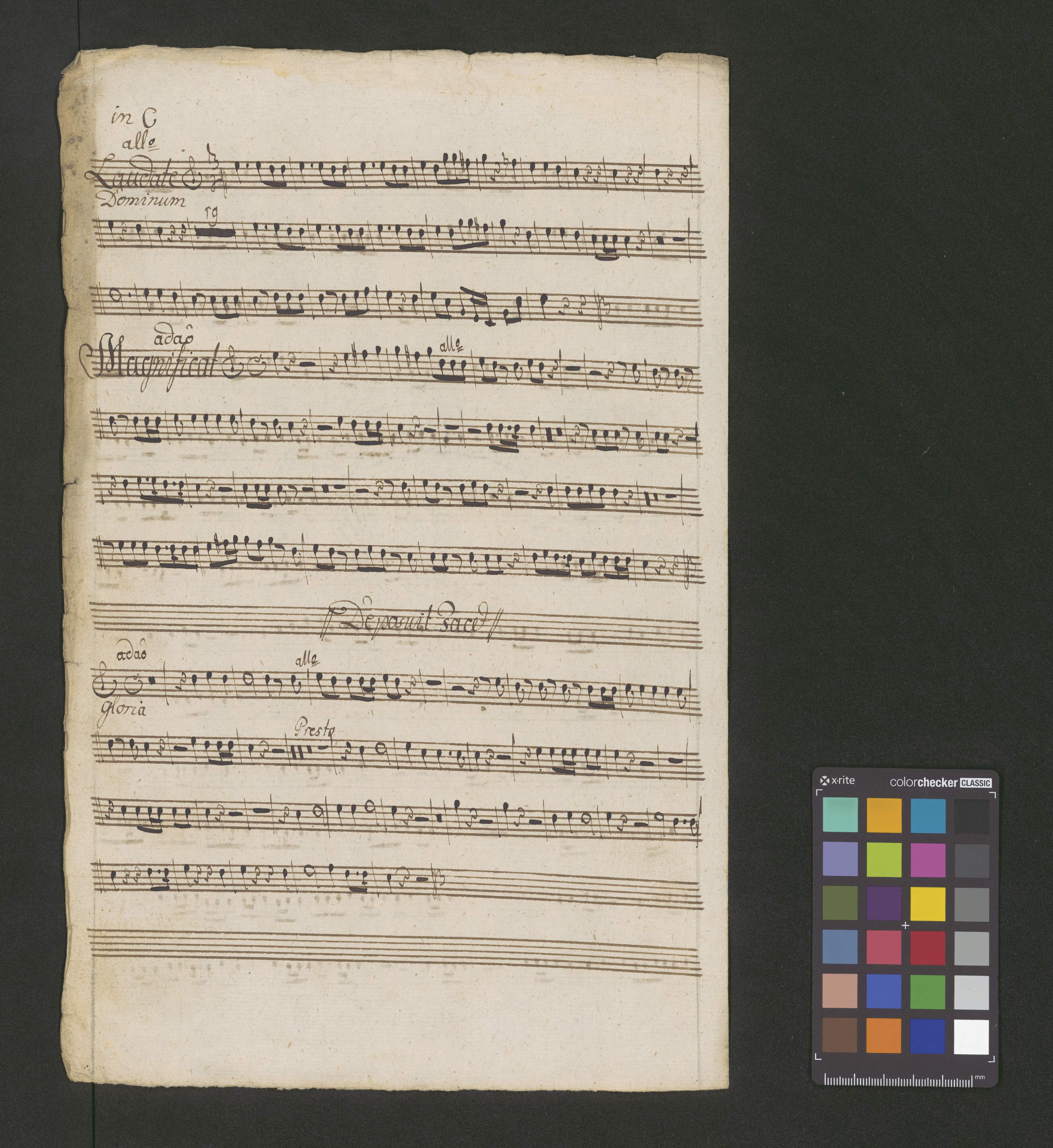 Vesperæ in C | De [crossed out:] Beata [added:] Confessoribus | a | Canto Alto. | Tenore Basso. | Violino Primo duplicato Violino Secundo | Oboa Prima Oboa Secunda | Clarino Primo Clarino Secundo | con | Organo. duplicato. | Del Signore Josepho Majer de Lichtna