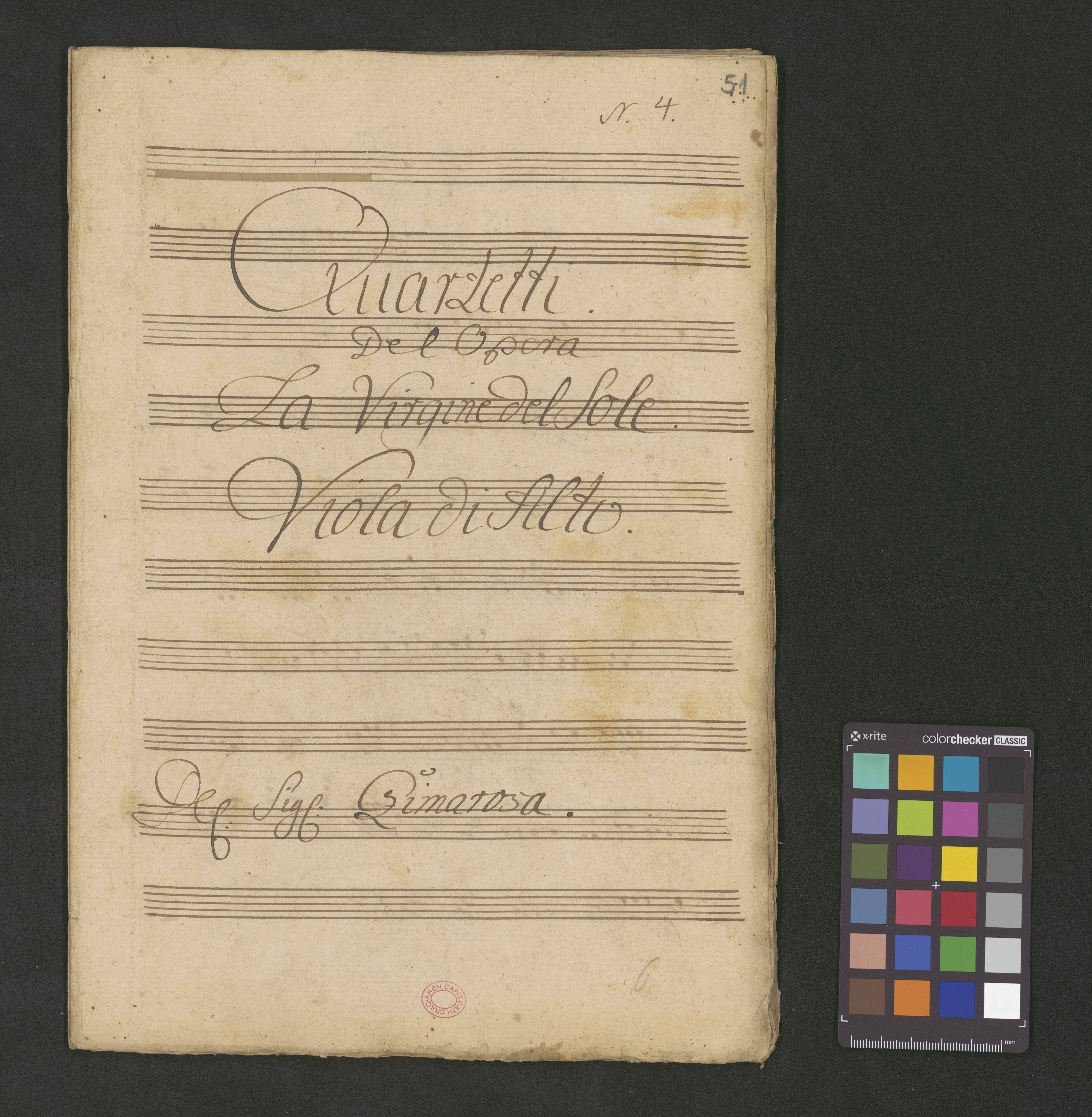 [on vl 1:] Quartetti. | à | Violino Primo. | del | Opera | La Vergine del Sole | del Sig|r|. Cimarosa