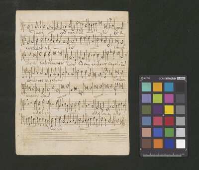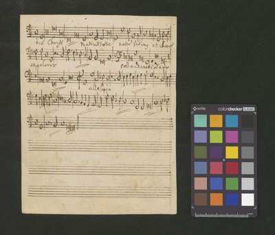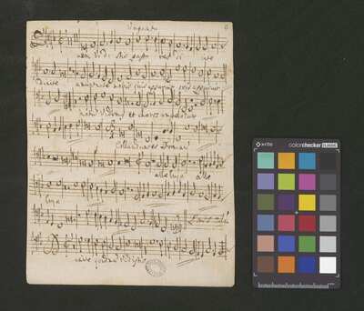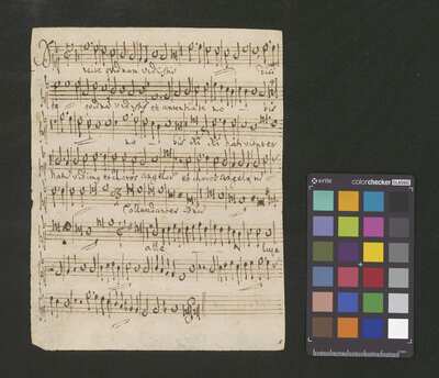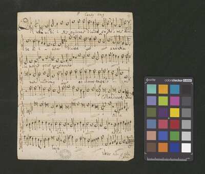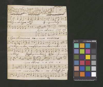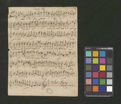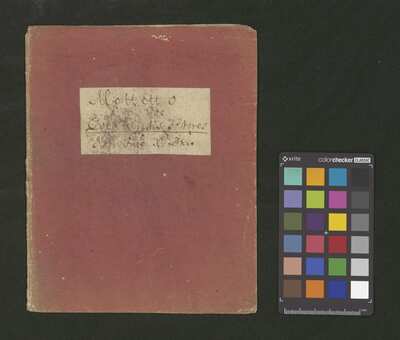 [pl-text: na wewnętrznej stronie obwoluty okrągła pieczęć: „ARCHIWUM I BIBLIOTEKA * Krakowskiej Kapituły Katedralnej”], [pl-text: na wybranych kartach rękopisu owalna pieczęć: „CATH. CRAC. * ARCH. CAPIT.”], [pl-text: na ostatniej karcie rękopisu zapisany fragment partii wokalnej obcego utworu], [pl-text: głos Vagans, zanotowany na karcie 6, zanotowany jest w kluczu tenorowym], [pl-text: głos Basso ripieno zanotowany w późniejszym czasie niż całość rękopisu. Służył najprawdopodobniej akompaniamentowi organisty], [pl-text: anonimowy skryptor A jest autorem większości kart rękopisu, sporządzonego w przedziale czasowym 1690-1710. Skryptorem B jest Józef Pękalski - prepozyt kapeli rorantystów w latach 1739-1761, który zanotował głos Basso ripieno.], [pl-text: Okładka rękopisu, wykonana z grubszego, różowego papieru, dodana została poźniej niż w trakcie sporządzania rękopisu. Na jej przedniej stronie naklejono kartkę zawierającą tytuł utworu zapisany przez skryptora A. Na f. 7v widoczny fragment wcześniej zanotowanego fragmentu głosu basowego litanii loretańskiej nieznanego autora.]