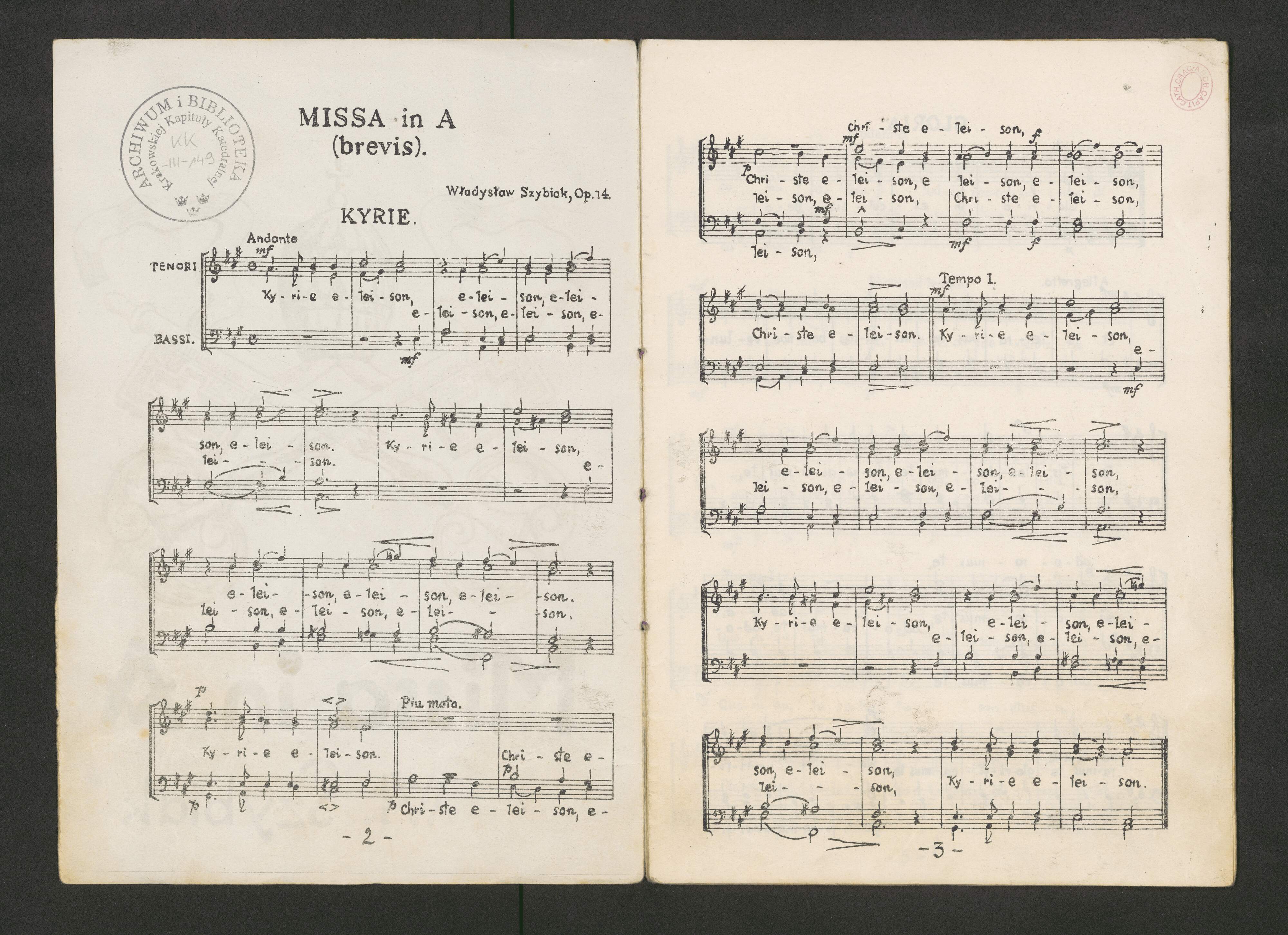 [title page:] Władysław Szybiak | Op. 14. | Missa in A | (brevis) | na cztery głosy męskie | a cappella. | Cena partytury K 1.50. | Drukiem zakładu Oscara Brandstettera w Lipsku
