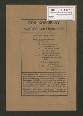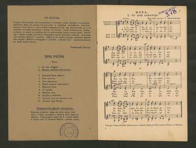 [pl-text: W zbiorze dwie pieśni do wykonywania podczas mszy i 10 innych pieśni religijnych.], [pl-text: Na str. [1] strona tytułowa.], [pl-text: Na str. [2] u góry przedmowa od autora, pośrodku spis treści, u dołu zapowiedź zbioru pieśni świeckich i informacja o możliwości nabycia publikacji z serii u autora.], [pl-text: Na str. [11] notka z recenzjami publikacji przytoczonymi z czasopism.], [pl-text: Na str. [12] informacja o wszystkich dotychczasowych publikacjach z serii oraz o innych wydanych utworach tego samego autora.], [pl-text: Na str. [1], 3, 5, 7, 9 pieczęć: "ROMAN PIRKL | 378".], [pl-text: Na str. [2] u dołu i na str. [11] okrągła pieczęć: „ARCHIWUM I BIBLIOTEKA”, „Krakowskiej Kapituły Katedralnej”; w pieczęci na str. [2] wpisana sygnatura: "KK | -III-238".], [pl-text: Na str. 5 u góry pieczęć: „CATH. CRAC. * ARCH. CAPIT.”], [pl-text: Na str. [12] w prawym górnym rogu prostokątna naklejka: "BIBLIOTEKA | Krakowskiej Kapituły Katedralnej | Sygn.: [puste pole]".], [pl-text: Na str. [1], 3, 5, 7, 9 pieczęć: "ROMAN PIRKL | 378".], [pl-text: Na str. [2] w lewym dolnym rogu i na str. [11] u dołu okrągła pieczęć: „ARCHIWUM I BIBLIOTEKA”, „Krakowskiej Kapituły Katedralnej”; w pieczęci na str. [2] wpisana sygnatura: "KK | -III-239".], [pl-text: Na str. 5 u góry pieczęć: „CATH. CRAC. * ARCH. CAPIT.”], [pl-text: Na str. [12] w prawym górnym rogu prostokątna naklejka: "BIBLIOTEKA | Krakowskiej Kapituły Katedralnej | Sygn.: [puste pole]".]