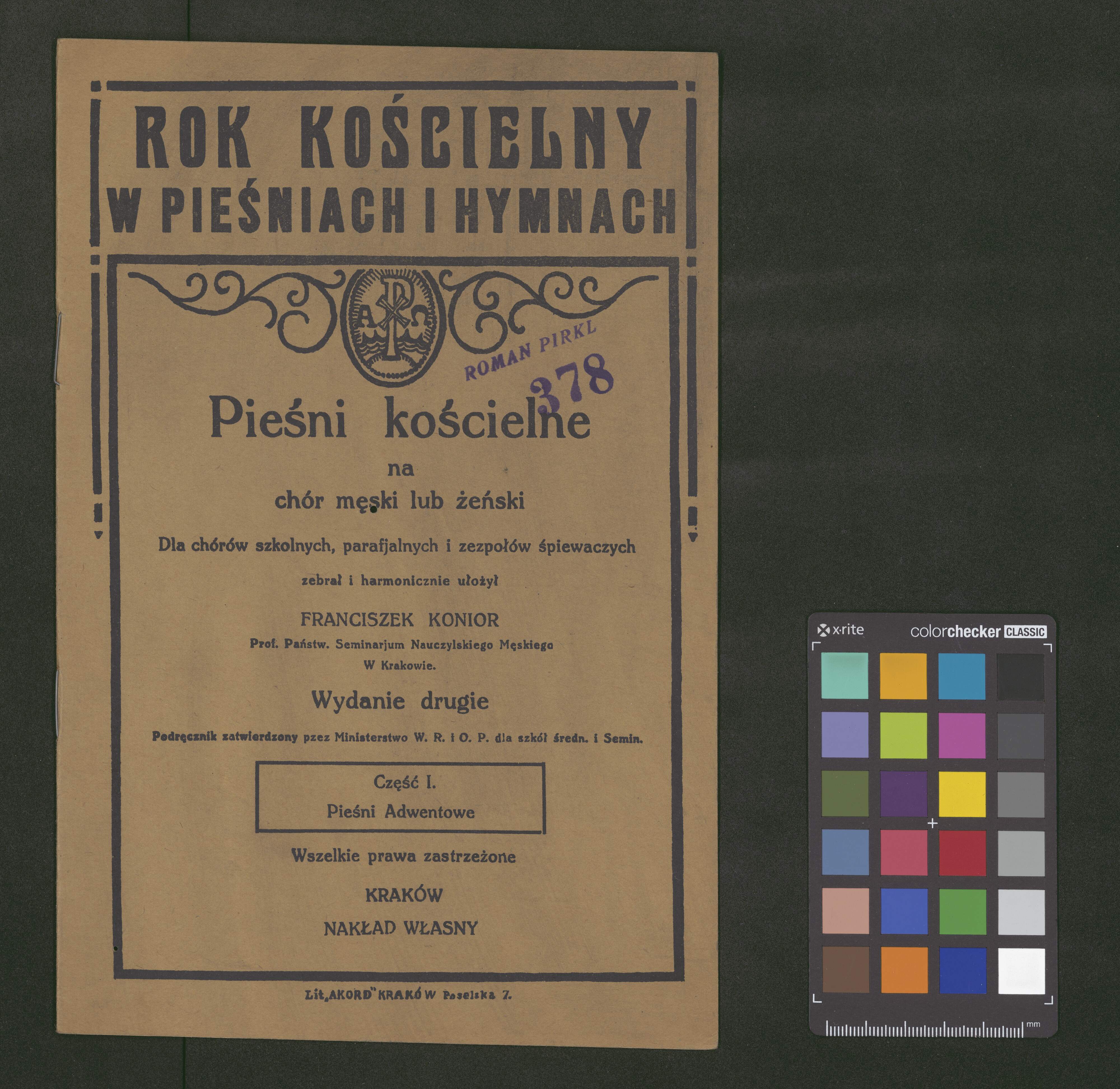 [cover:] ROK KOŚCIELNY | W PIEŚNIACH I HYMNACH | Pieśni kościelne | na | chór męski lub żeński | Dla chórów szkolnych, parafjalnych i zezpołów [!] śpiewaczych | zebrał i harmonicznie ułożył | FRANCISZEK KONIOR | Prof. Państw. Seminarjum Nauczycielskiego Męskiego | W Krakowie. Wydanie drugie | Podręcznik zatwierdzony przez Ministerstwo W. R. i O. P. dla szkół średn. i Semin. | [in frame:] Część I. | Pieśni Adwentowe | [below the frame:] Wszelkie prawa zastrzeżone | KRAKÓW | NAKŁAD WŁASNY | Lit "AKORD" KRAKÓW Poselska 7