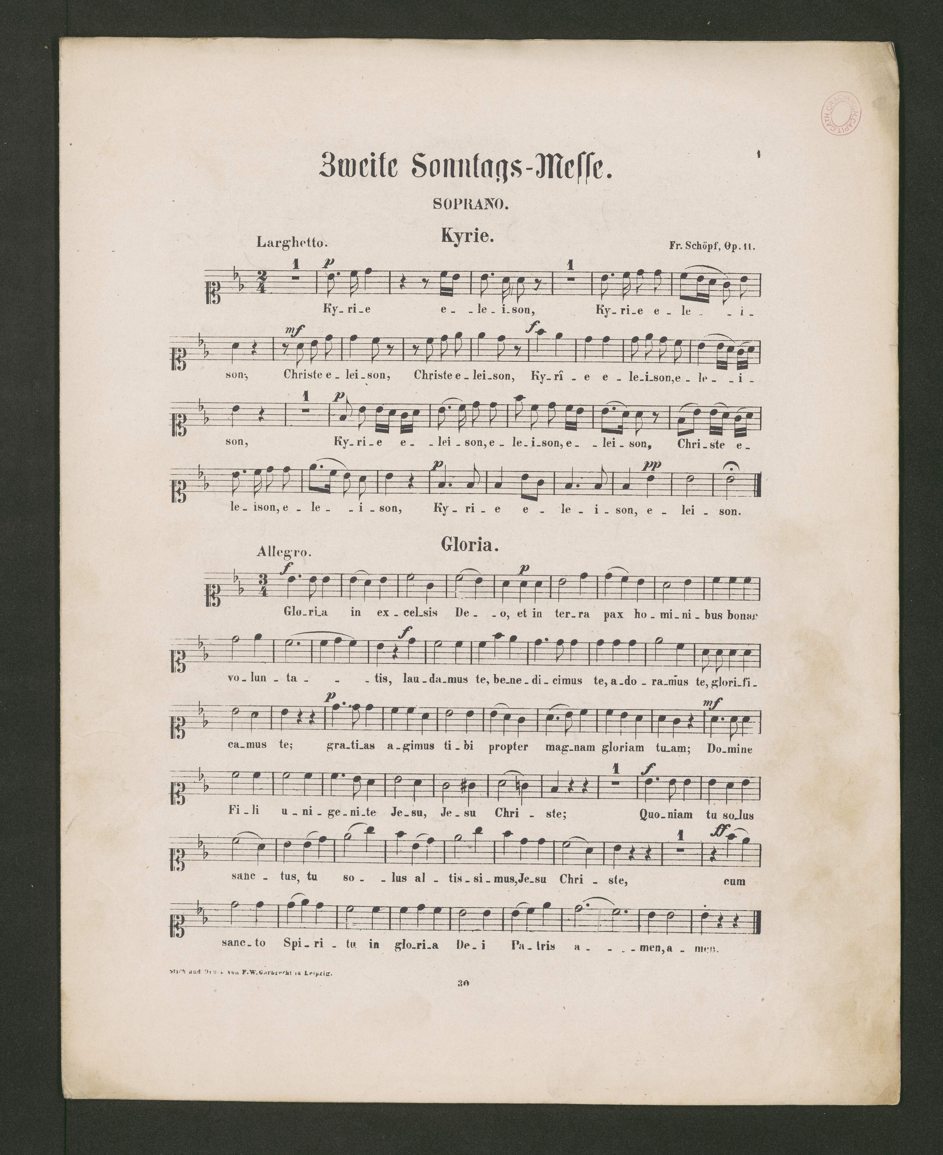 [cover page:] 6 | Sonntags-Messen. | [...] N|o| 2. MESSE IN B. | Op. 11. Für drei oder vier Singstimmen. zwei Violinen, Violon u. Orgel | obligat, zewi Clarinetten, zwei Horn, zwei Trompeten u. Pauken ad libitum. [...] | kurz und leicht componirt | von | FRANZ SCHÖPF, | Vorstand des Süd-Tyroler Cäcilien-Vereins. | [...] | NEUE AUFLAGE. | Verlags Eighthum | der Kunst- und Musikalienhandlung JOHANN GROSS in INNSBRUCK. | (S. A. Reiss.) | [...] | Lith. Aust. v. F. W. Garbrecht Leipzig