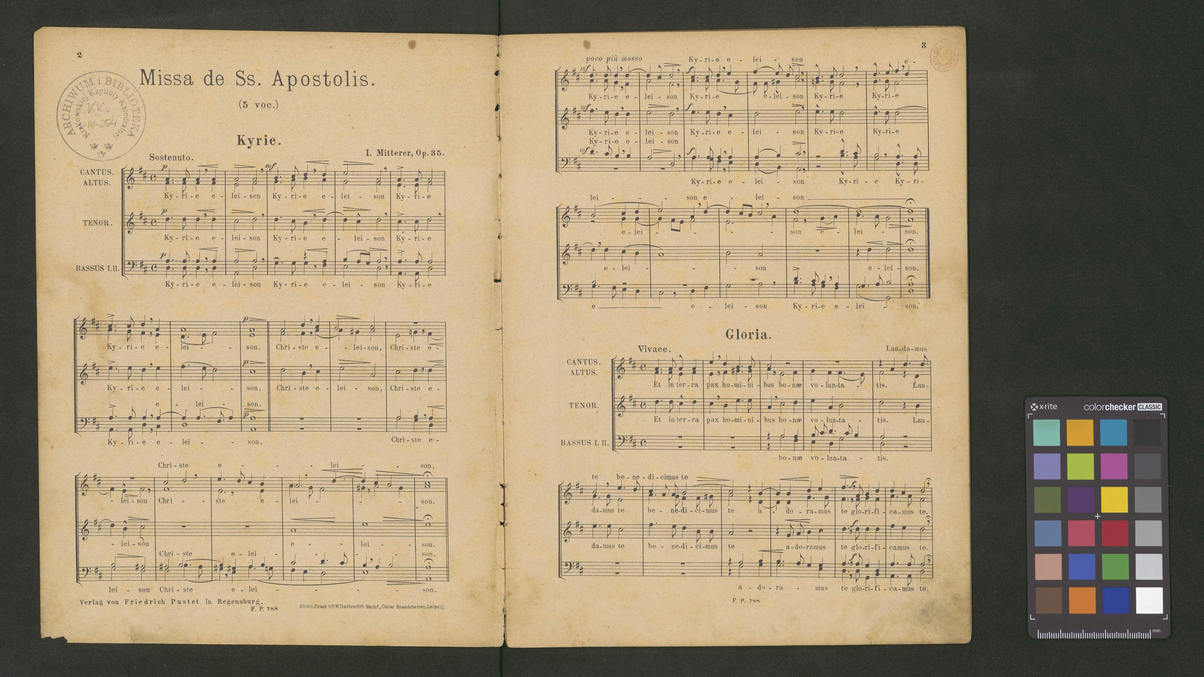 [page title:] MISSA BREVIS | DE SANCTUS APOSTOLIS | QINQUE VOCUM. | COMPOSUIT | IGNATIUS MITTERER | ECCL. CATH. BRIXINENSIS CHORI RECTOR | Op. 35 | MDCCCLXXXVI. | RATISBONAE, NEO EBORACI & CINCINNATII. | SUMPTIBUS ET CHARTIS FRIDERICI PUSTET, | S. SEDIS APOSTOLICAE TYPOGRAPHI