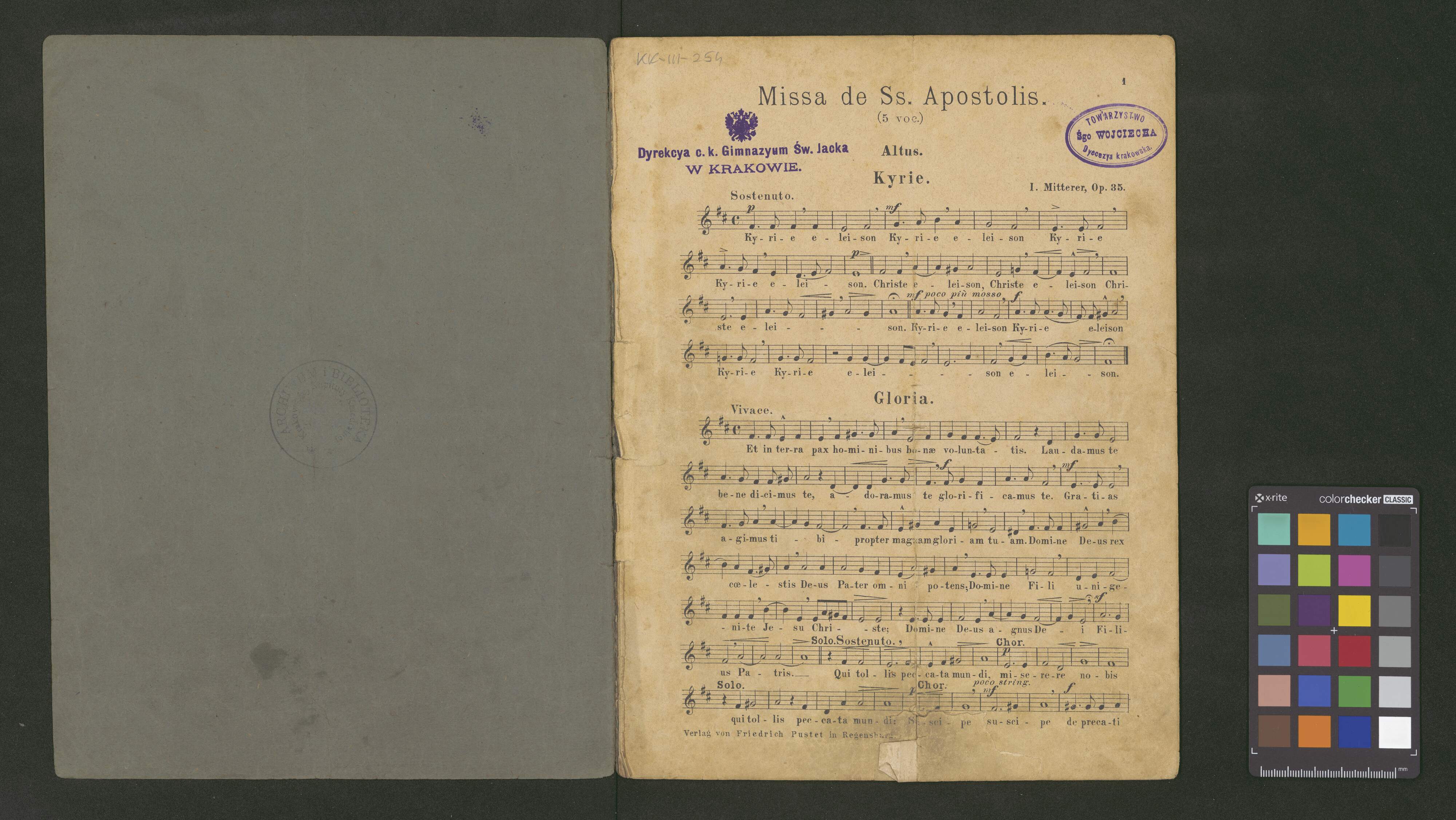 [page title:] MISSA BREVIS | DE SANCTUS APOSTOLIS | QINQUE VOCUM. | COMPOSUIT | IGNATIUS MITTERER | ECCL. CATH. BRIXINENSIS CHORI RECTOR | Op. 35 | MDCCCLXXXVI. | RATISBONAE, NEO EBORACI & CINCINNATII. | SUMPTIBUS ET CHARTIS FRIDERICI PUSTET, | S. SEDIS APOSTOLICAE TYPOGRAPHI
