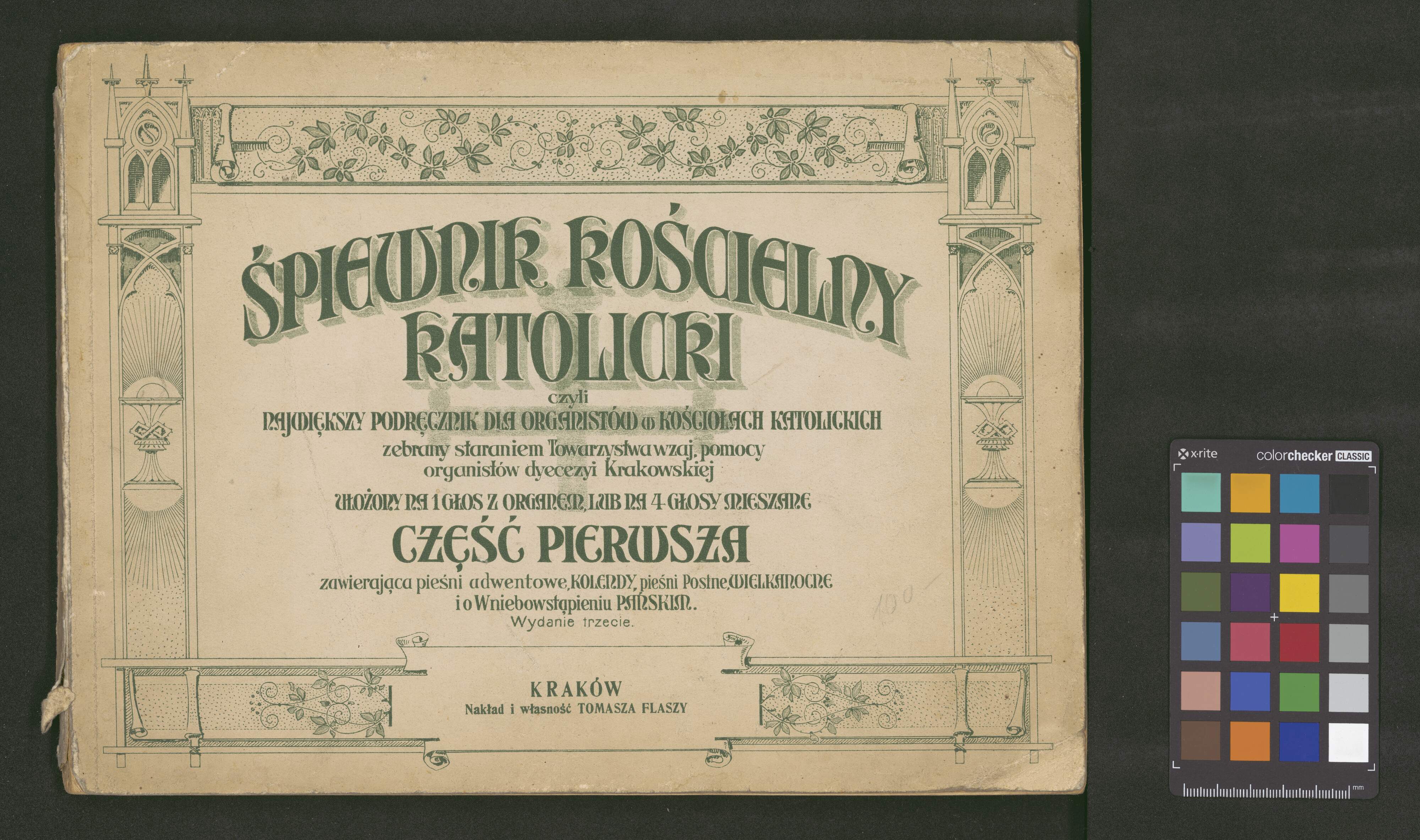 [cover and page title:] ŚPIEWNIK KOŚCIELNY KATOLICKI | czyli | NAJWIĘKSZY PODRĘCZNIK DLA ORGANISTÓW w KOŚCIOŁACH KATOLICKICH | zebrany staraniem Towarzystwa wzaj. pomocy | organistów diecezyi Krakowskiej | UŁOŻONY NA 1 GŁOS ORGANEM LUB NA 4 GŁOSY MIESZANE | CZĘŚĆ PIERWSZA | zawierająca pieśni adwentowe, KOLĘDY, pieśni Postne, WIELKANOCNE | i o Wniebowstąpieniu PAŃSKIM. | Wydanie trzecie. | KRAKÓW | Nakład i własność TOMASZA FLASZY