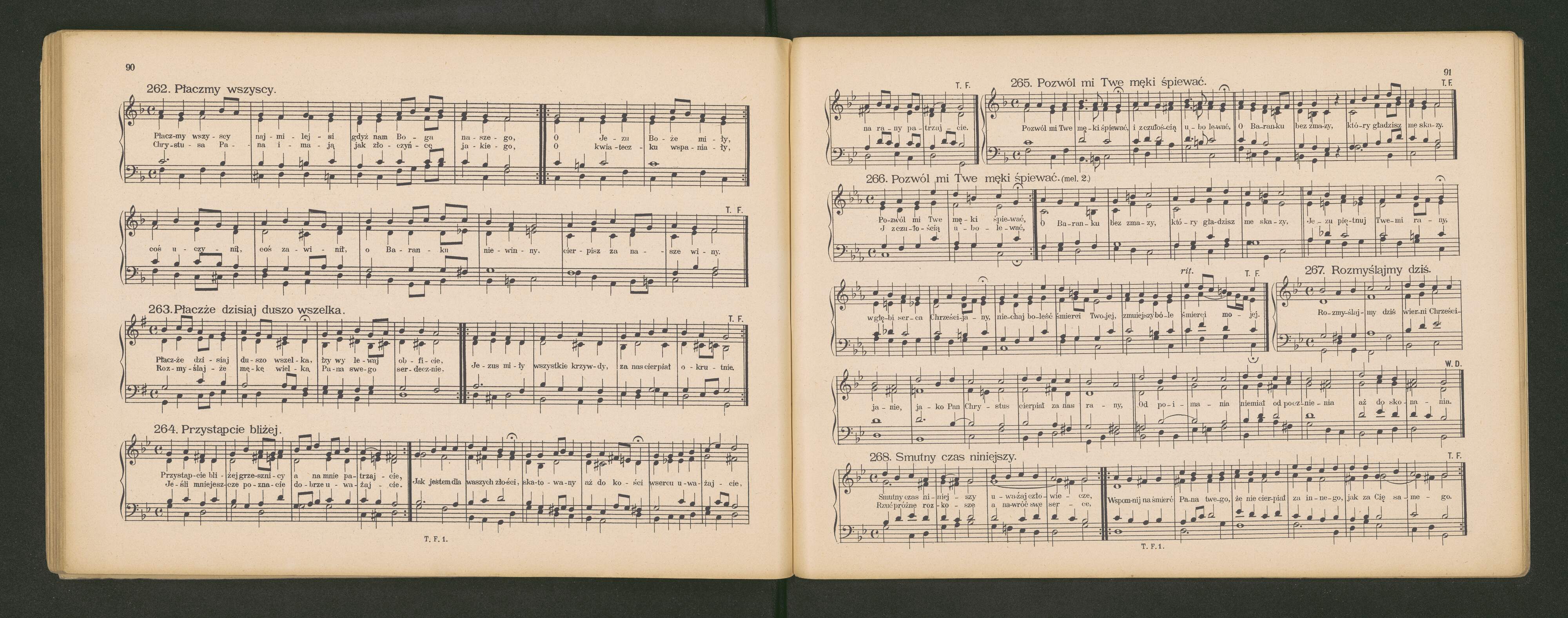 [cover and page title:] ŚPIEWNIK KOŚCIELNY KATOLICKI | czyli | NAJWIĘKSZY PODRĘCZNIK DLA ORGANISTÓW w KOŚCIOŁACH KATOLICKICH | zebrany staraniem Towarzystwa wzaj. pomocy | organistów diecezyi Krakowskiej | UŁOŻONY NA 1 GŁOS ORGANEM LUB NA 4 GŁOSY MIESZANE | CZĘŚĆ PIERWSZA | zawierająca pieśni adwentowe, KOLĘDY, pieśni Postne, WIELKANOCNE | i o Wniebowstąpieniu PAŃSKIM. | Wydanie trzecie. | KRAKÓW | Nakład i własność TOMASZA FLASZY