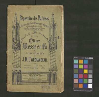 [pl-text: W dolnym brzegu pierwszej strony okładki rozmazana prostokątna niebieska pieczęć. Czytelna jedynie cyfra "400" w ostatnim wierszu pieczęci.], [pl-text: Okładka podklejana wzmacnianym papierem.], [pl-text: Pieczęć: „ARCHIWUM I BIBLIOTEKA”, „Krakowskiej Kapituły Katedralnej” wraz z wpisaną ołówkiem sygnaturą na odwrocie okładki. Pieczęć: „CATH. CRAC. * ARCH. CAPIT.” na str. 3, 21.], [pl-text: W górnej części pierwszej strony: wpisane ołówkiem dawne sygnatury oraz naniesione dwie pieczęci: po lewej okrągła pieczęć "Biblioteka chóru Cecyliańskiego * LWÓW * Dwerlińskiego * 48"; po prawej częściowo zamazana pieczęć: "ZGROMADZENIE | KS (nieczytelne) JONARZY | Kraków, u. św. Filipa 19".]