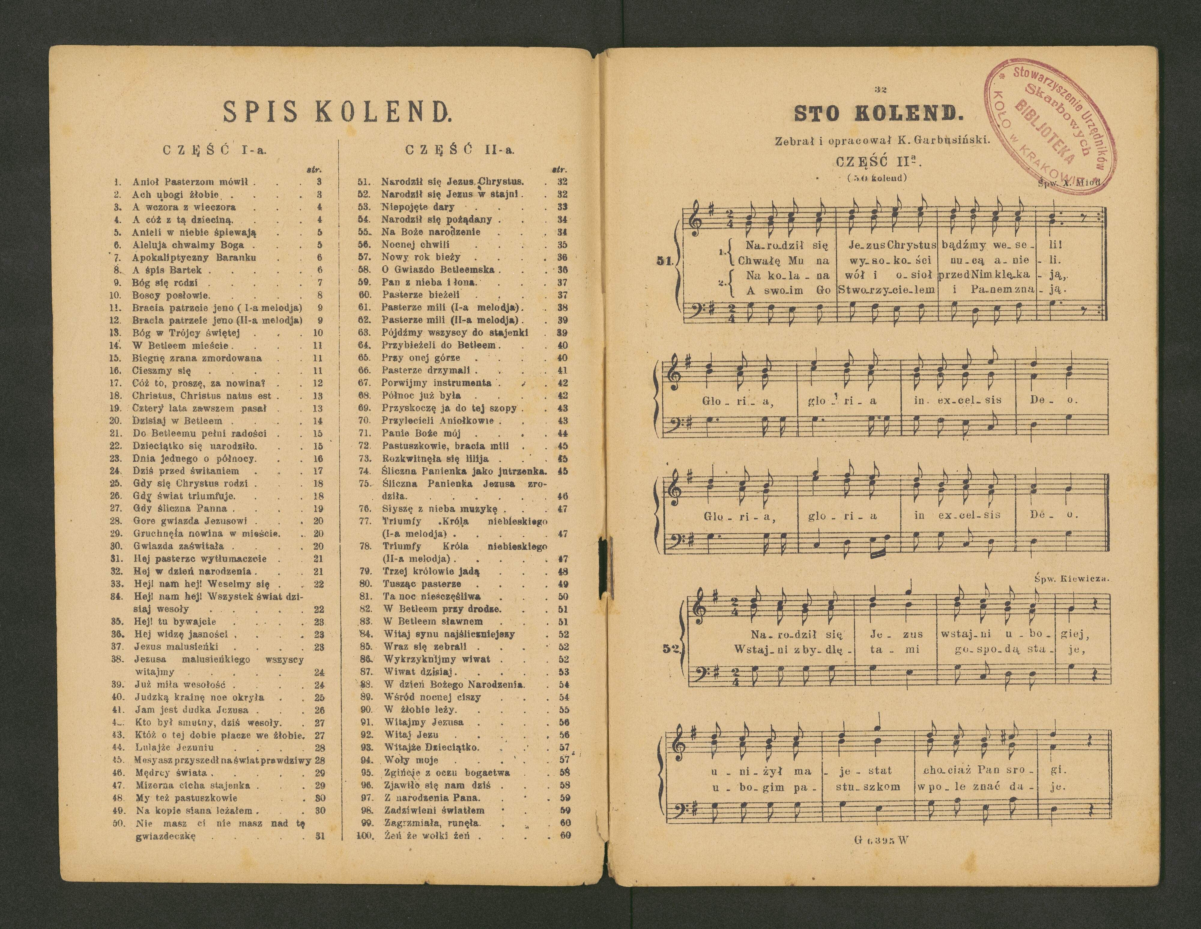 [cover title:] 100 | KOLEND | NA CHÓR 3i4 GŁOSOWY MĘSKI À CAPELLA | DO UŻYTKU KOŚCIELNEGO SZKOLNEGO I DOMOWEGO ~ | ZEBRAŁ I OPRACOWAŁ | KAZIMIERZ GARBUSIŃSKI | NAUCZYCIEL ŚPIEWU W SZKOŁACH PAŃSTWOWYCH I | DYREKTOR TOWARZYSTWA ORATORYJNEGO W KRAKOWIE | CZĘŚĆ I ~ 50 KOLEND | LAUDATE DOMINUM CZĘŚĆ II | CZĘŚĆ I ~ 50 KOLEND | LAUDATE DOMINUM CZĘŚĆ III | NAKŁAD I WŁASNOŚĆ | GEBETHNERA I WOLFFA | WARSZAWA ~ KRAKÓW ~ LUBLIN ~ ŁÓDŹ ~ POZNAŃ | WILNO ~ ZAKOPANE