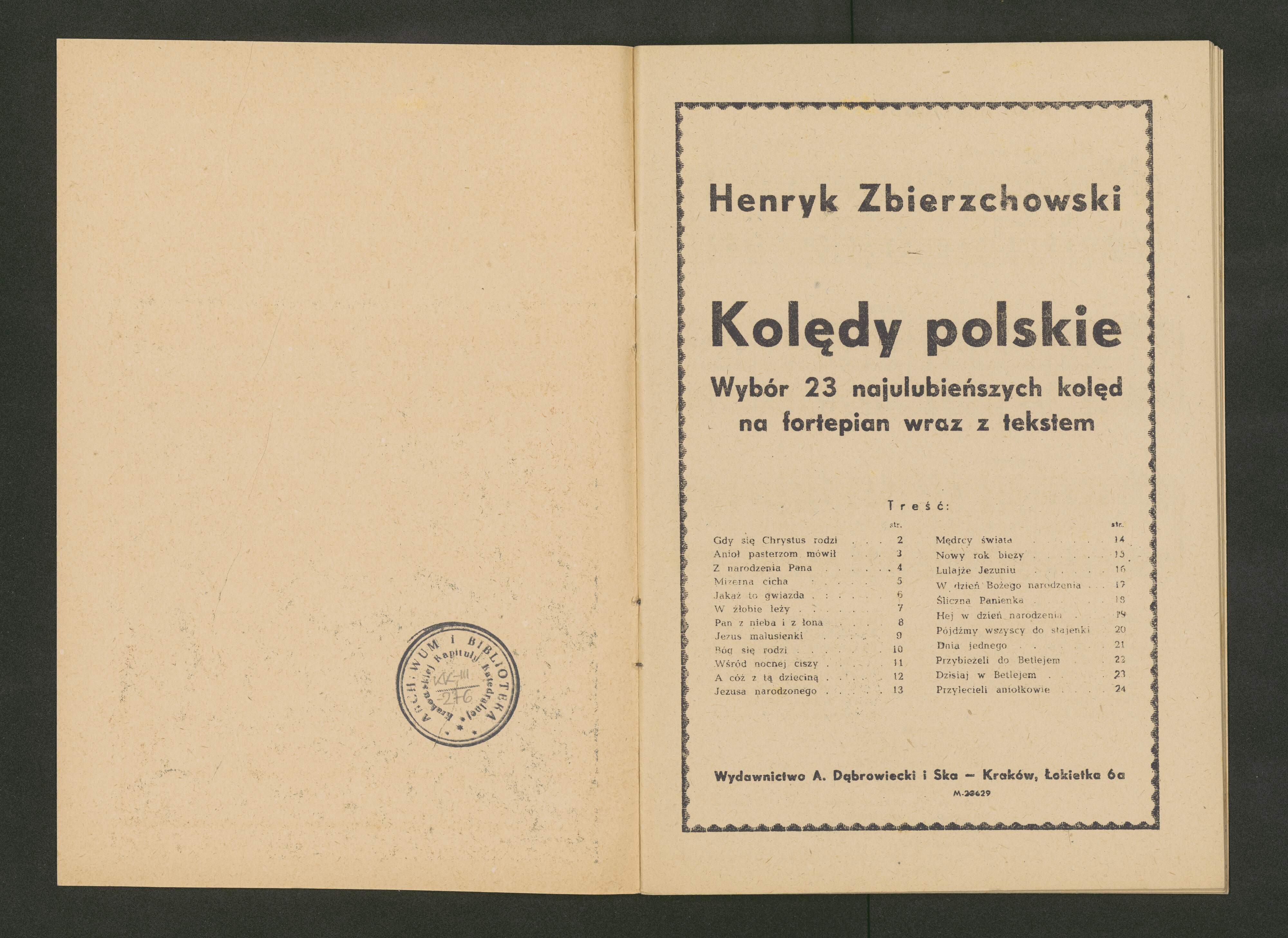 [title page:] Henryk Zbierzchowski | Kolędy polskie | Wybór 23 najulubieńszych kolęd | na fortepian wraz z tekstem | [spis treści] | Wydawnictwo A. Dąbrowiecki i Ska - Kraków, Łokietka 6 a | M.20629
