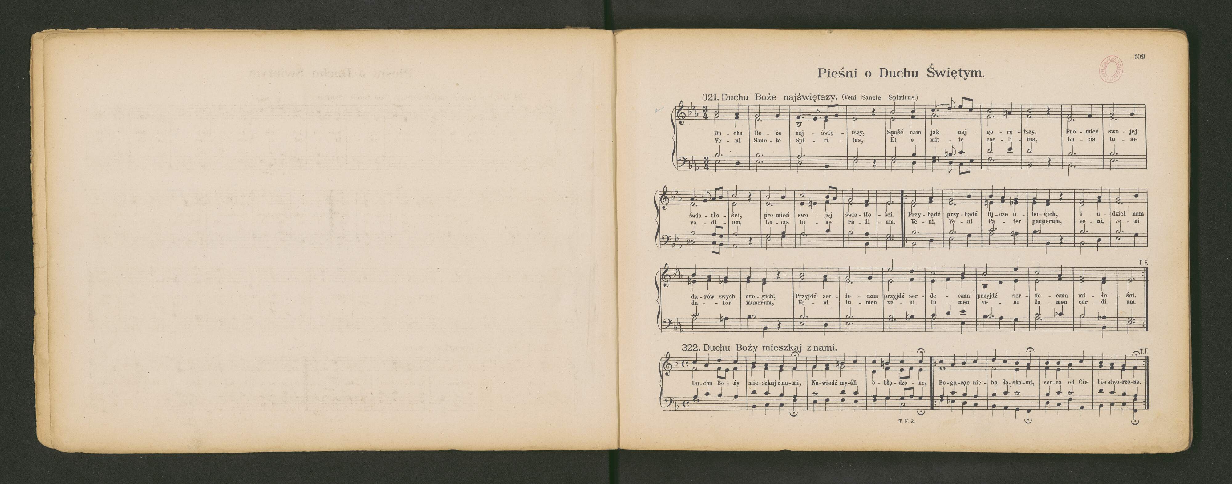 [cover and page title:] ŚPIEWNIK KOŚCIELNY KATOLICKI | czyli | NAJWIĘKSZY PODRĘCZNIK DLA ORGANISTÓW w KOŚCIOŁACH KATOLICKICH | zebrany staraniem Towarzystwa wzaj. pomocy | organistów diecezyi Krakowskiej | UŁOŻONY NA 1 GŁOS ORGANEM LUB NA 4 GŁOSY MIESZANE | CZĘŚĆ DRUGA | zawierający pieśni: DO DUCHA ŚWIĘTEGO, DO TRÓJCY ŚW., NA BOŻE CIAŁO, HYMNI SACRI | SUPLIKACYE, pieśni do P. JEZUSA. DO SERCA P. JEZUSA. DO M. BOSKIEJ. | GODZINKI, LITANIE, RÓŻANIEC I KORONKI. | Cena | Wydanie trzecie poprawione. | KRAKÓW | Nakład i własność TOMASZA FLASZY | Główny skład w księgarni | ANTONIEGO PIWARSKIEGO I SKI