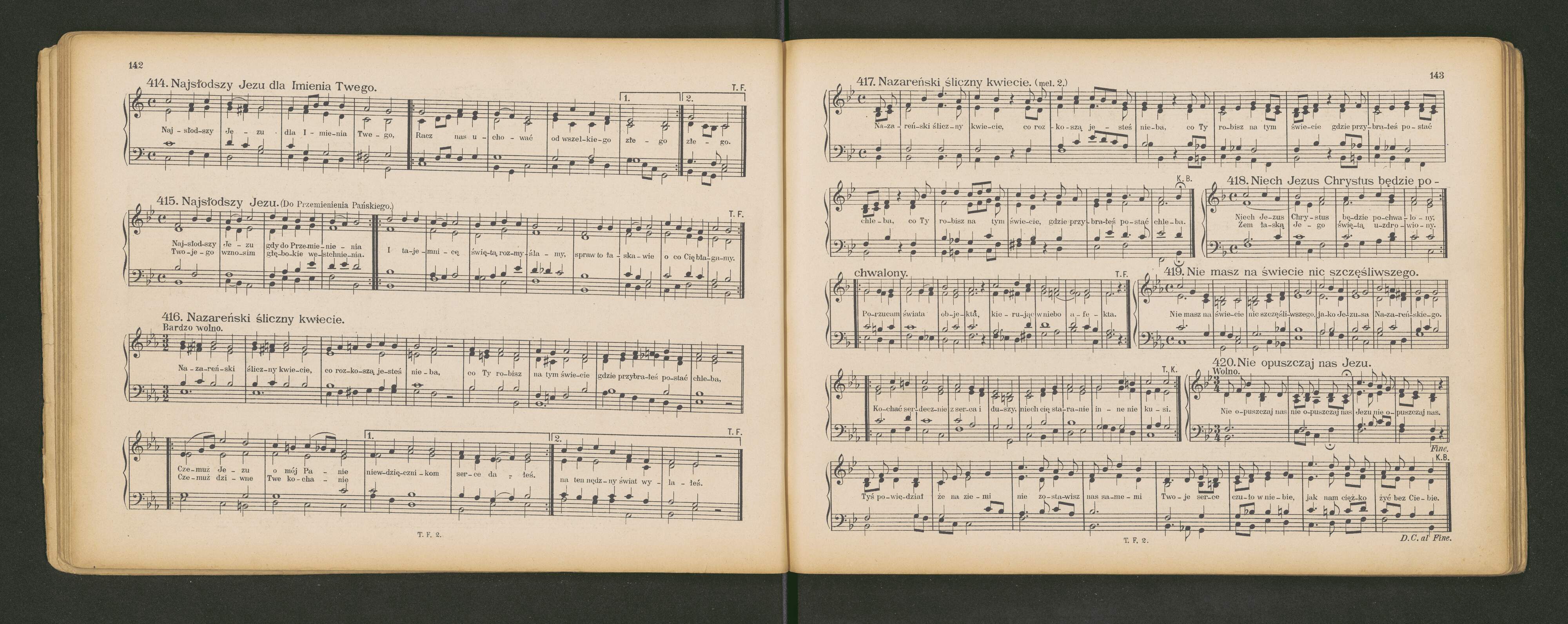 [cover and page title:] ŚPIEWNIK KOŚCIELNY KATOLICKI | czyli | NAJWIĘKSZY PODRĘCZNIK DLA ORGANISTÓW w KOŚCIOŁACH KATOLICKICH | zebrany staraniem Towarzystwa wzaj. pomocy | organistów diecezyi Krakowskiej | UŁOŻONY NA 1 GŁOS ORGANEM LUB NA 4 GŁOSY MIESZANE | CZĘŚĆ DRUGA | zawierający pieśni: DO DUCHA ŚWIĘTEGO, DO TRÓJCY ŚW., NA BOŻE CIAŁO, HYMNI SACRI | SUPLIKACYE, pieśni do P. JEZUSA. DO SERCA P. JEZUSA. DO M. BOSKIEJ. | GODZINKI, LITANIE, RÓŻANIEC I KORONKI. | Cena | Wydanie trzecie poprawione. | KRAKÓW | Nakład i własność TOMASZA FLASZY | Główny skład w księgarni | ANTONIEGO PIWARSKIEGO I SKI