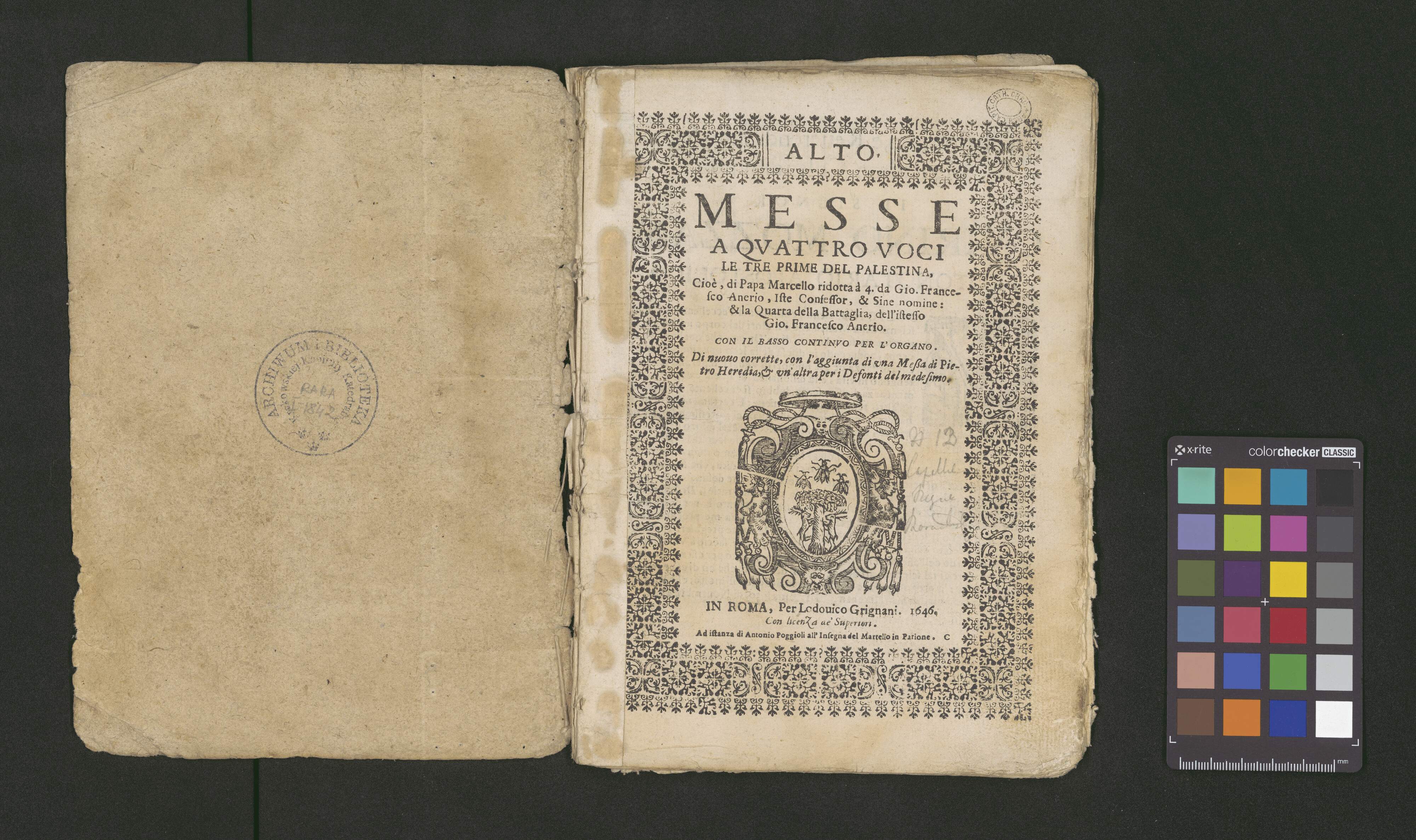 CANTO. | MESSE | A QVATTRO VOCI | LE TRE PRIME DE PALESTINA [!] | Cioè, di Papa Marcello ridotta à 4. da Gio. France- | sco Anerio, Iste Confessor, & Sine Nomine: | & la Quarta della Battaglia, dell'istesso | Gio. Francesco Anerio. | CON IL BASSO CONTINVO PER L'ORGANO. | Di nuouo corrette, con l'aggiunta di vna Meßa di Pie- | tro Heredia, et vn'altra per i Defonti del medesimo. | [printer's mark] | IN ROMA, Per Lodouico Grignani. 1646. | Con LicenZa de' Superiori. | Ad istanza di Antonio Poggioli all'Insegna del Martello in Parione