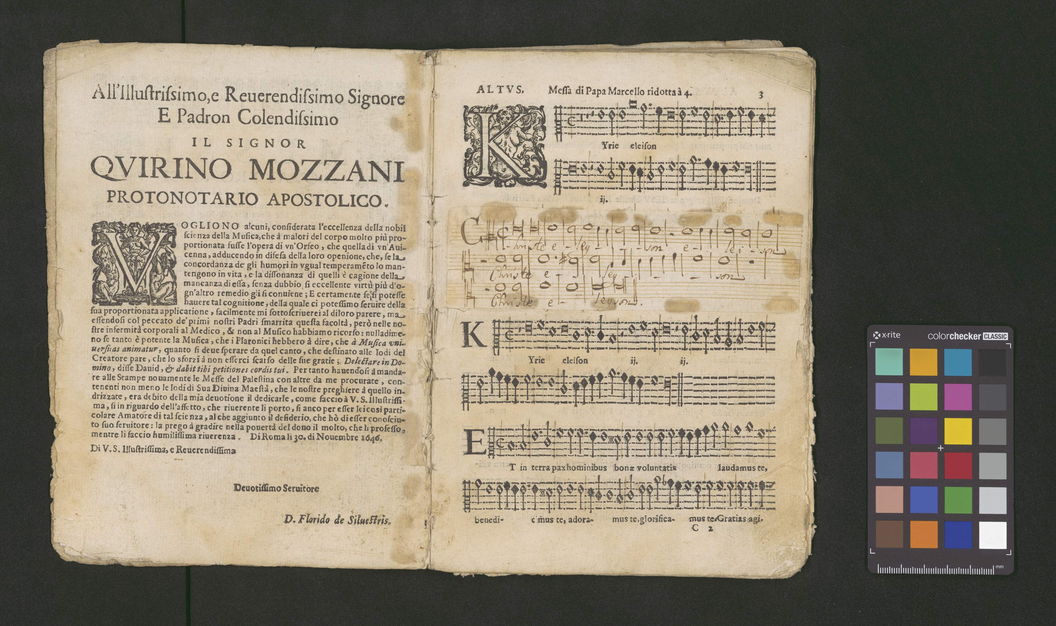 CANTO. | MESSE | A QVATTRO VOCI | LE TRE PRIME DE PALESTINA [!] | Cioè, di Papa Marcello ridotta à 4. da Gio. France- | sco Anerio, Iste Confessor, & Sine Nomine: | & la Quarta della Battaglia, dell'istesso | Gio. Francesco Anerio. | CON IL BASSO CONTINVO PER L'ORGANO. | Di nuouo corrette, con l'aggiunta di vna Meßa di Pie- | tro Heredia, et vn'altra per i Defonti del medesimo. | [printer's mark] | IN ROMA, Per Lodouico Grignani. 1646. | Con LicenZa de' Superiori. | Ad istanza di Antonio Poggioli all'Insegna del Martello in Parione