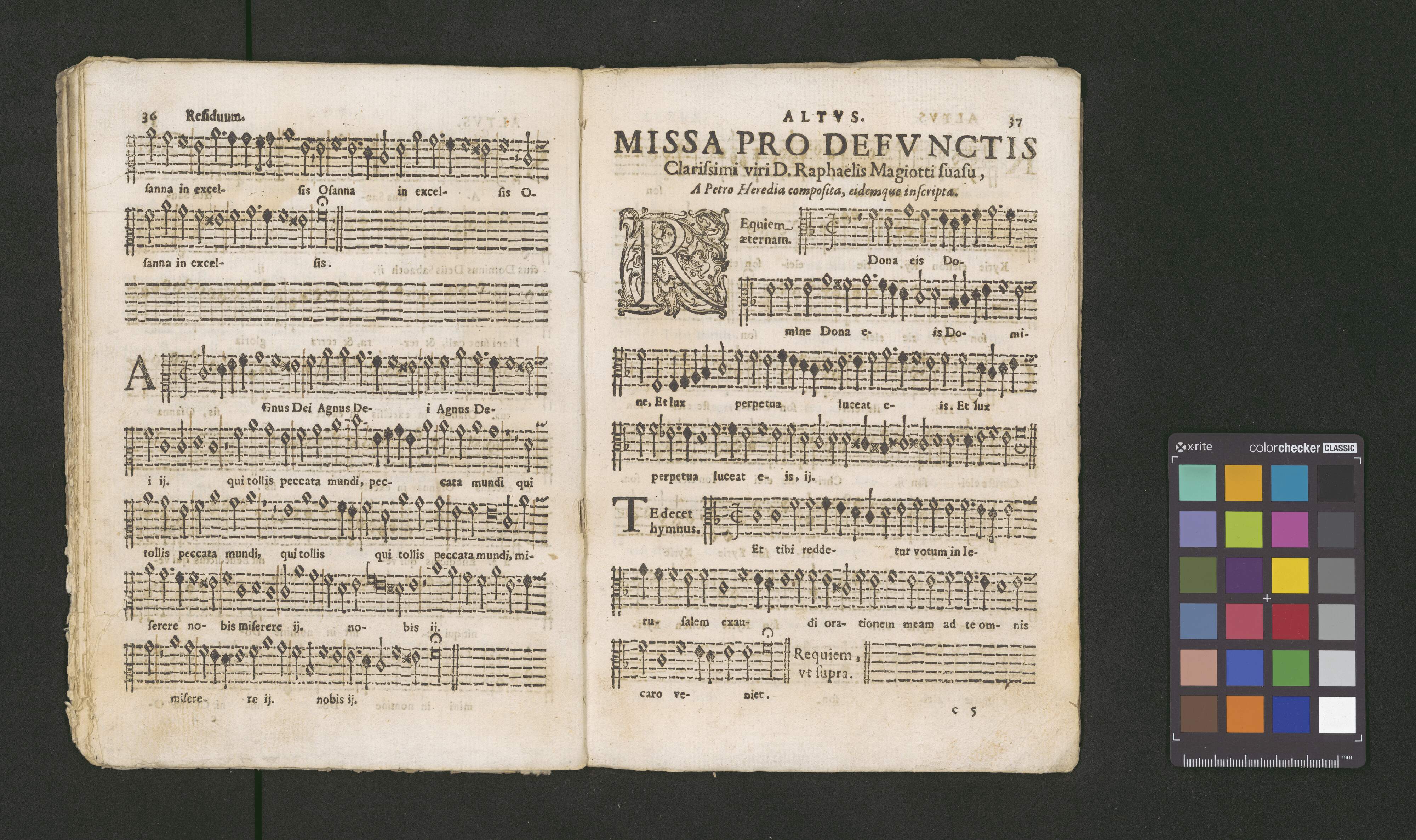 CANTO. | MESSE | A QVATTRO VOCI | LE TRE PRIME DE PALESTINA [!] | Cioè, di Papa Marcello ridotta à 4. da Gio. France- | sco Anerio, Iste Confessor, & Sine Nomine: | & la Quarta della Battaglia, dell'istesso | Gio. Francesco Anerio. | CON IL BASSO CONTINVO PER L'ORGANO. | Di nuouo corrette, con l'aggiunta di vna Meßa di Pie- | tro Heredia, et vn'altra per i Defonti del medesimo. | [printer's mark] | IN ROMA, Per Lodouico Grignani. 1646. | Con LicenZa de' Superiori. | Ad istanza di Antonio Poggioli all'Insegna del Martello in Parione