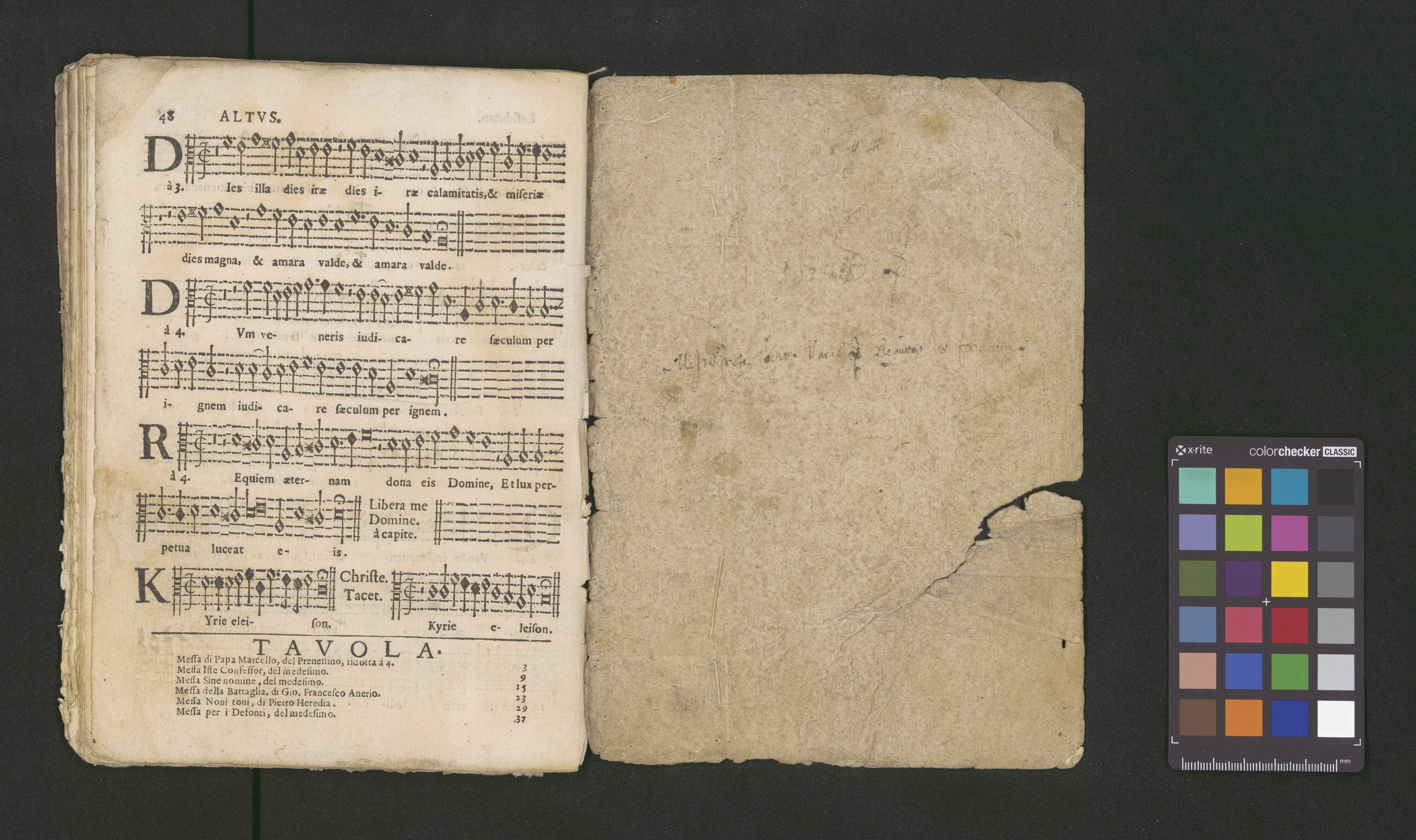 CANTO. | MESSE | A QVATTRO VOCI | LE TRE PRIME DE PALESTINA [!] | Cioè, di Papa Marcello ridotta à 4. da Gio. France- | sco Anerio, Iste Confessor, & Sine Nomine: | & la Quarta della Battaglia, dell'istesso | Gio. Francesco Anerio. | CON IL BASSO CONTINVO PER L'ORGANO. | Di nuouo corrette, con l'aggiunta di vna Meßa di Pie- | tro Heredia, et vn'altra per i Defonti del medesimo. | [printer's mark] | IN ROMA, Per Lodouico Grignani. 1646. | Con LicenZa de' Superiori. | Ad istanza di Antonio Poggioli all'Insegna del Martello in Parione