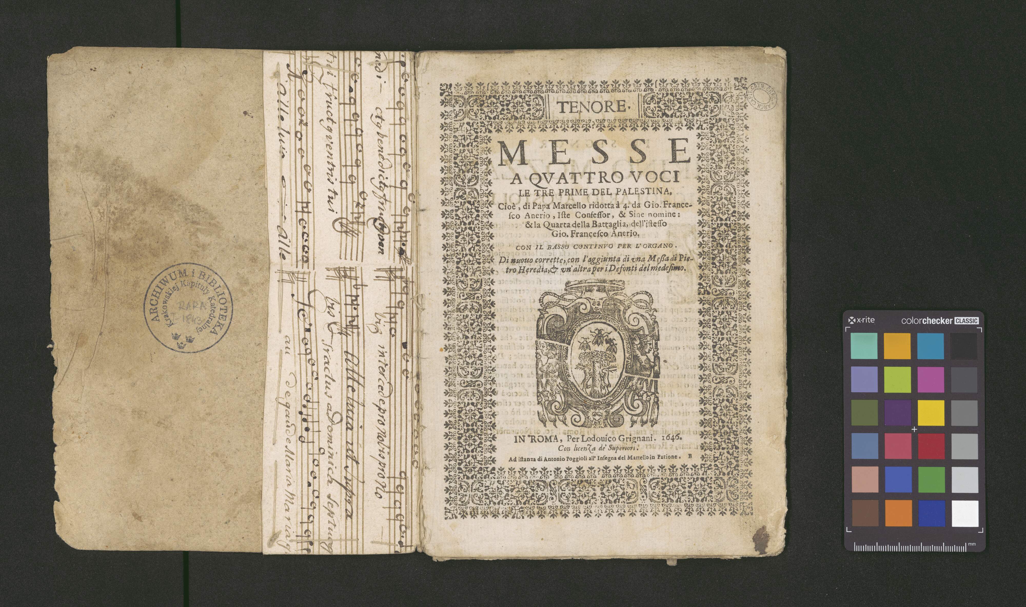 CANTO. | MESSE | A QVATTRO VOCI | LE TRE PRIME DE PALESTINA [!] | Cioè, di Papa Marcello ridotta à 4. da Gio. France- | sco Anerio, Iste Confessor, & Sine Nomine: | & la Quarta della Battaglia, dell'istesso | Gio. Francesco Anerio. | CON IL BASSO CONTINVO PER L'ORGANO. | Di nuouo corrette, con l'aggiunta di vna Meßa di Pie- | tro Heredia, et vn'altra per i Defonti del medesimo. | [printer's mark] | IN ROMA, Per Lodouico Grignani. 1646. | Con LicenZa de' Superiori. | Ad istanza di Antonio Poggioli all'Insegna del Martello in Parione