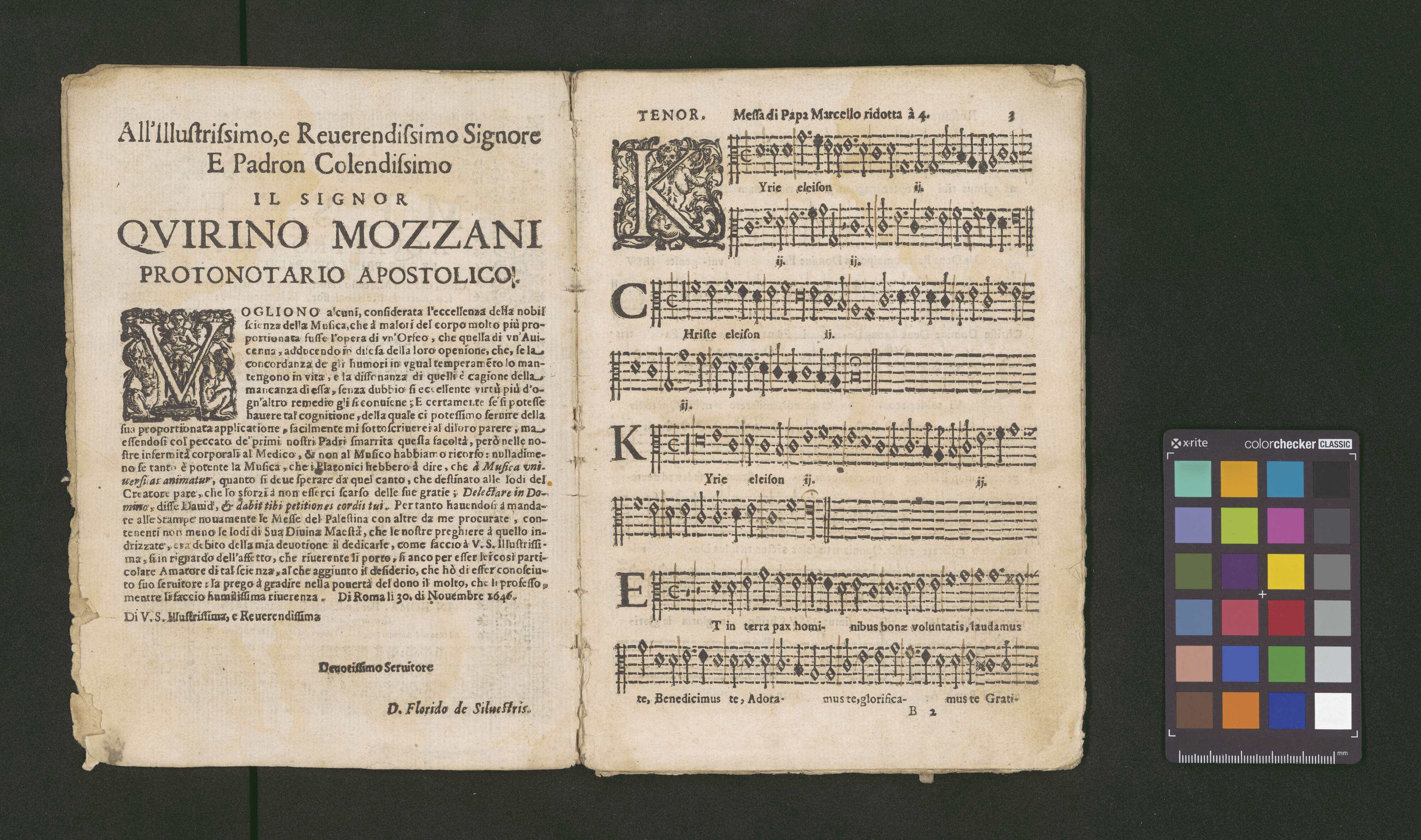 CANTO. | MESSE | A QVATTRO VOCI | LE TRE PRIME DE PALESTINA [!] | Cioè, di Papa Marcello ridotta à 4. da Gio. France- | sco Anerio, Iste Confessor, & Sine Nomine: | & la Quarta della Battaglia, dell'istesso | Gio. Francesco Anerio. | CON IL BASSO CONTINVO PER L'ORGANO. | Di nuouo corrette, con l'aggiunta di vna Meßa di Pie- | tro Heredia, et vn'altra per i Defonti del medesimo. | [printer's mark] | IN ROMA, Per Lodouico Grignani. 1646. | Con LicenZa de' Superiori. | Ad istanza di Antonio Poggioli all'Insegna del Martello in Parione