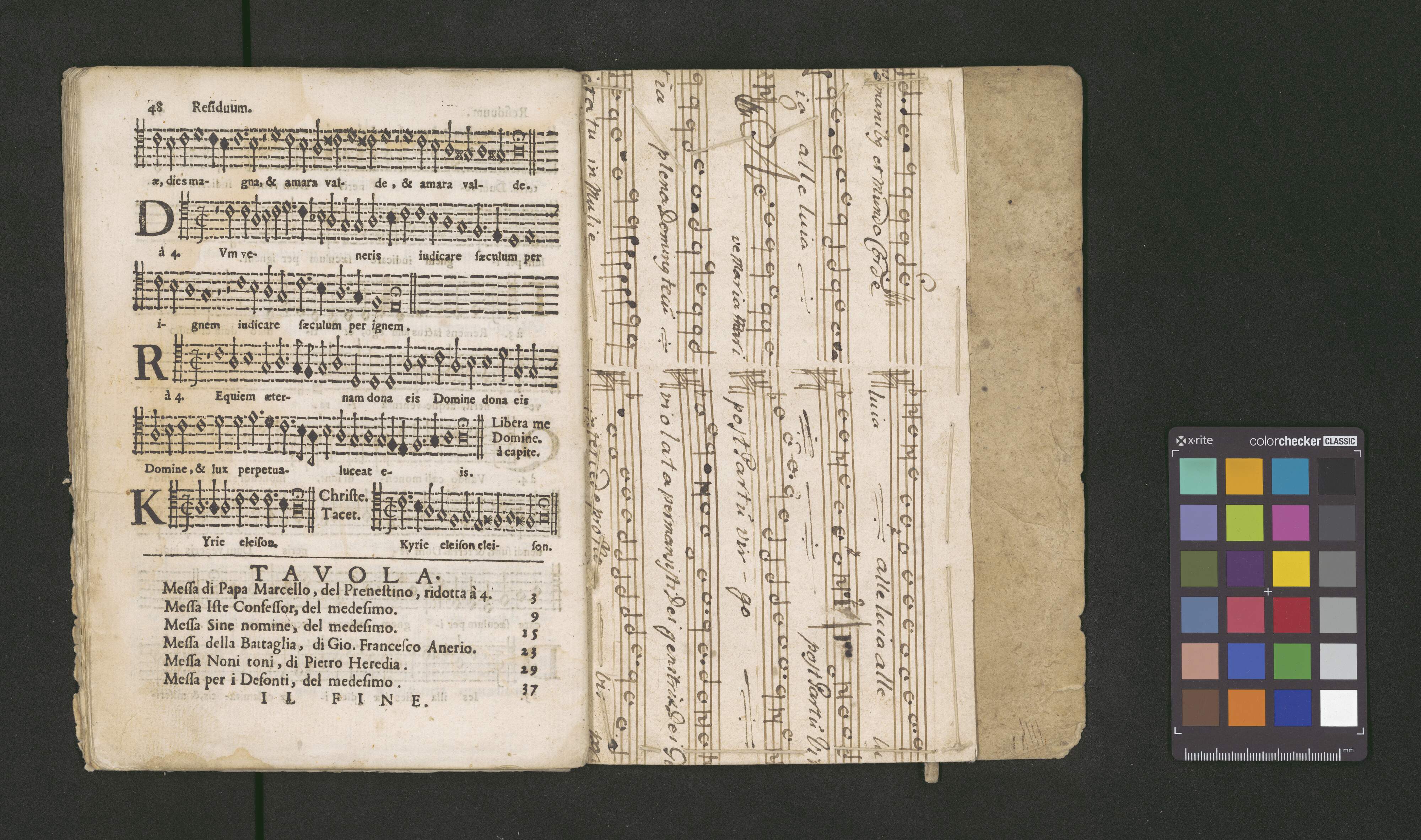 CANTO. | MESSE | A QVATTRO VOCI | LE TRE PRIME DE PALESTINA [!] | Cioè, di Papa Marcello ridotta à 4. da Gio. France- | sco Anerio, Iste Confessor, & Sine Nomine: | & la Quarta della Battaglia, dell'istesso | Gio. Francesco Anerio. | CON IL BASSO CONTINVO PER L'ORGANO. | Di nuouo corrette, con l'aggiunta di vna Meßa di Pie- | tro Heredia, et vn'altra per i Defonti del medesimo. | [printer's mark] | IN ROMA, Per Lodouico Grignani. 1646. | Con LicenZa de' Superiori. | Ad istanza di Antonio Poggioli all'Insegna del Martello in Parione