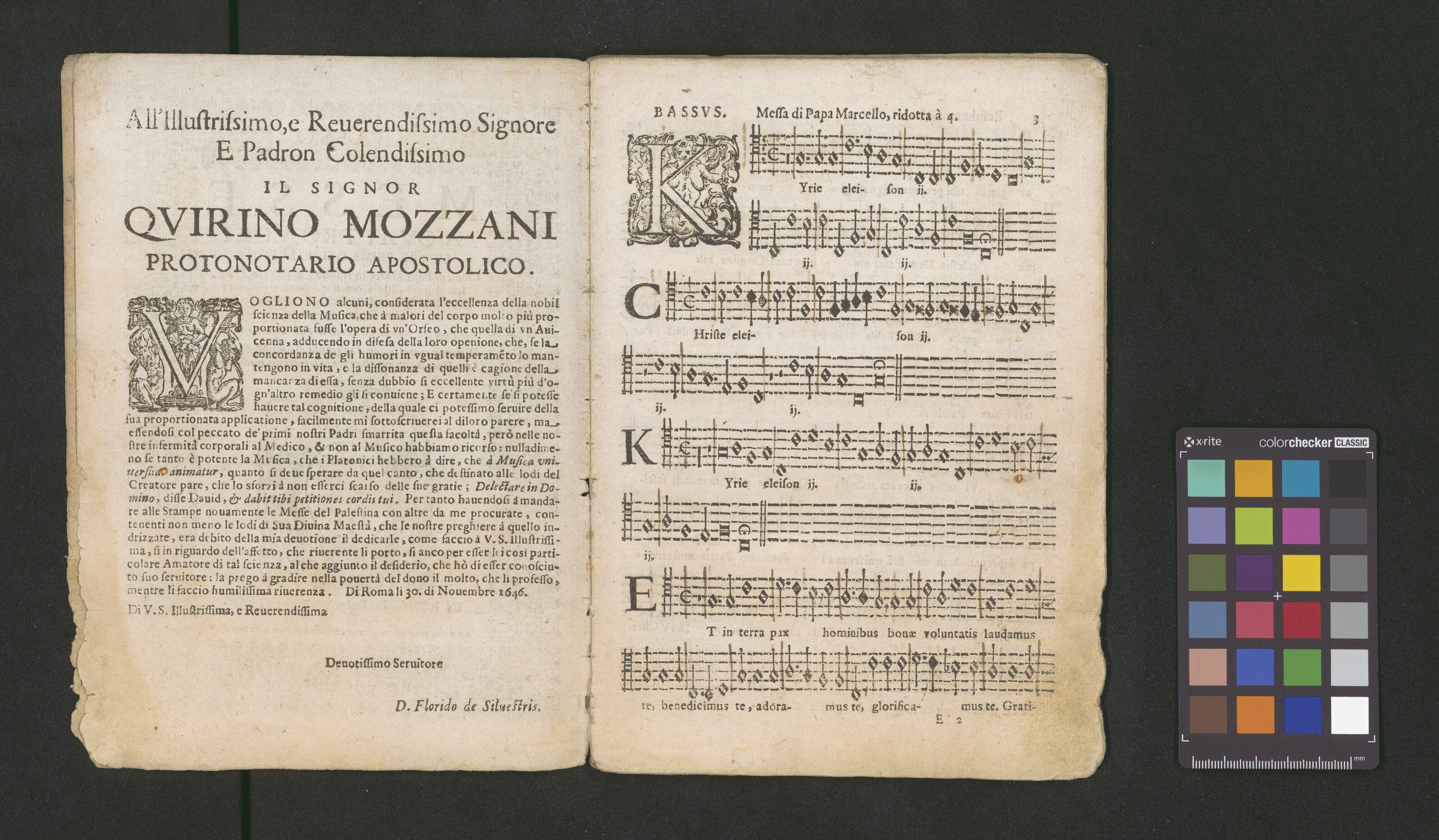 CANTO. | MESSE | A QVATTRO VOCI | LE TRE PRIME DE PALESTINA [!] | Cioè, di Papa Marcello ridotta à 4. da Gio. France- | sco Anerio, Iste Confessor, & Sine Nomine: | & la Quarta della Battaglia, dell'istesso | Gio. Francesco Anerio. | CON IL BASSO CONTINVO PER L'ORGANO. | Di nuouo corrette, con l'aggiunta di vna Meßa di Pie- | tro Heredia, et vn'altra per i Defonti del medesimo. | [printer's mark] | IN ROMA, Per Lodouico Grignani. 1646. | Con LicenZa de' Superiori. | Ad istanza di Antonio Poggioli all'Insegna del Martello in Parione