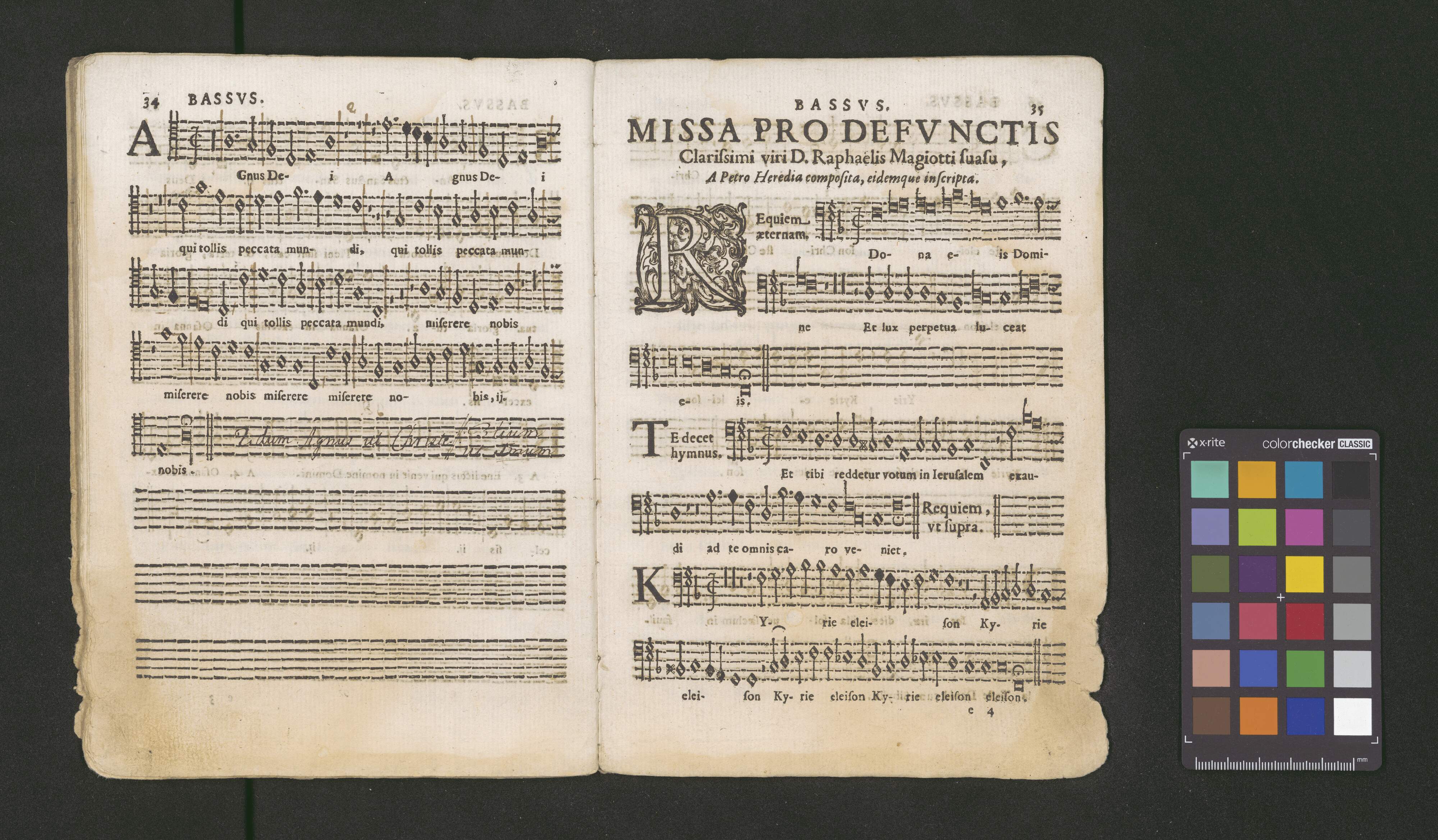 CANTO. | MESSE | A QVATTRO VOCI | LE TRE PRIME DE PALESTINA [!] | Cioè, di Papa Marcello ridotta à 4. da Gio. France- | sco Anerio, Iste Confessor, & Sine Nomine: | & la Quarta della Battaglia, dell'istesso | Gio. Francesco Anerio. | CON IL BASSO CONTINVO PER L'ORGANO. | Di nuouo corrette, con l'aggiunta di vna Meßa di Pie- | tro Heredia, et vn'altra per i Defonti del medesimo. | [printer's mark] | IN ROMA, Per Lodouico Grignani. 1646. | Con LicenZa de' Superiori. | Ad istanza di Antonio Poggioli all'Insegna del Martello in Parione