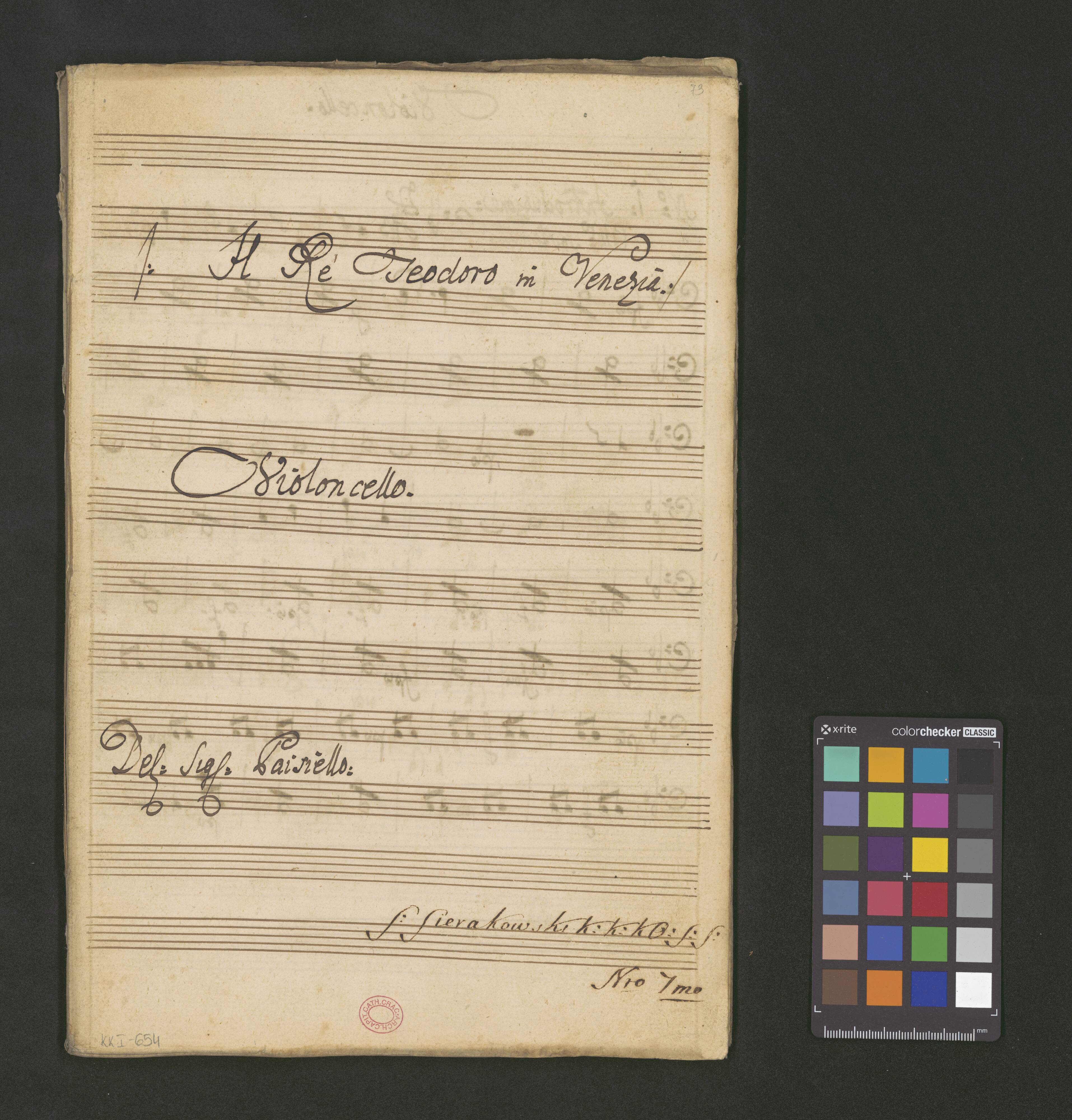 [title page:] /: H Rè Theodoro in Venezia:/ | Opera | Quator | a | Violino Primo | Violino Secondo | Viola di Alto | con | Violonzello. | Del: Sig: Paisiello: | S: Sierakowski K:K:K:O S:Swa | N: 1mo