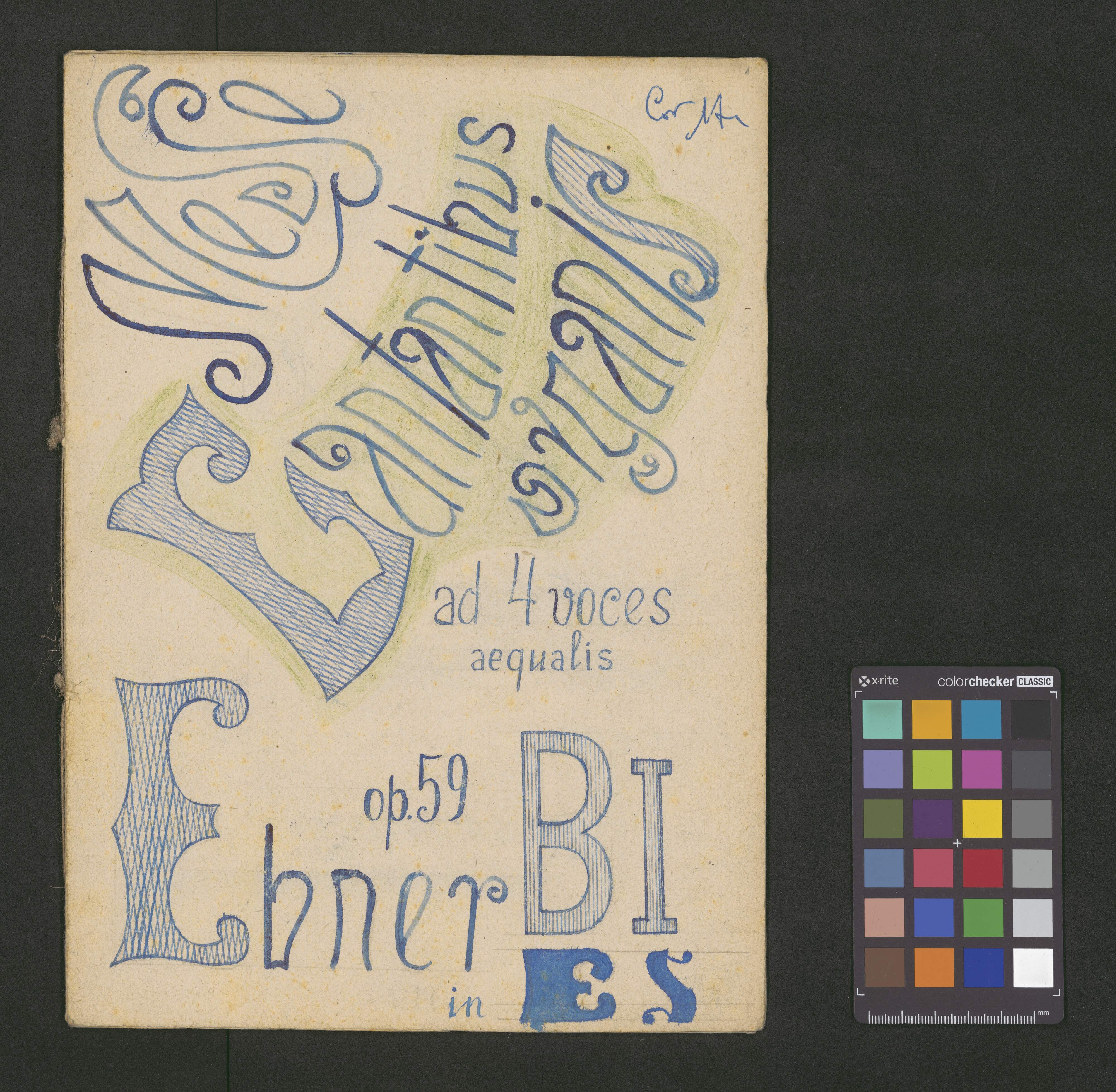 [on the T 1 partbook:] Messe | "Eantantibus | organis" | ad 4 voces | aequalis | L. op. 59 | Ebner | T.I. | in ES