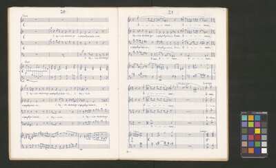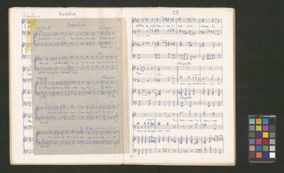[pl-text: Pieczęć okrągła o treści "ARCHIWUM I BIBLIOTEKA | Krakowskiej Kapituły Katedralnej | KK-I | -773/1 [2,3,4]" na drugiej stronie.], [pl-text: Mała, czerwona, owalna pieczęć "CATH. CRAC. * ARCH. CAPIT." w prawym górnym rogu trzeciej strony.], [pl-text: W prawym górnym rogu każdej strony wpisana ołówkiem paginacja.], [pl-text: W obu egzemplarzach partytury w części Sanctus doklejona alternatywna wersja.]