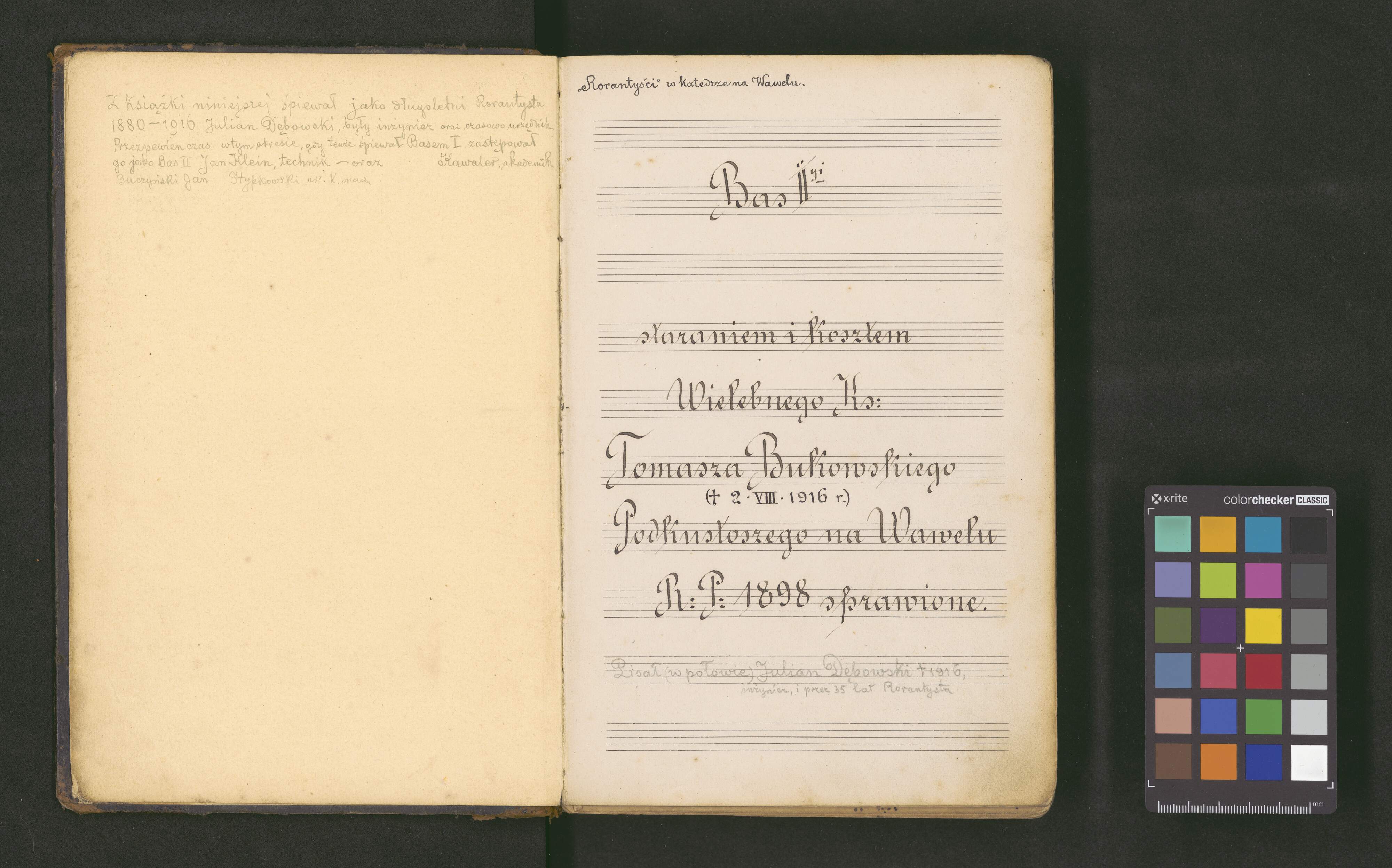 [title page:] [upper left corner:] "Rorantyści" w katedrze na Wawelu. | [center:] Bas II |g|i | staraniem i kosztem | Wielebnego Ks: | Tomasza Bukowskiego | [different hand:] (✝ 2 • VIII • 1916 r.) | [previous hand:] Podkustoszego na Wawelu | R: P: 1898 sprawione. | [with pencil:] Pisał (w połowie) Julian Dębowski ✝ 1916, | inżynier, i przez 35 lat Rorantysta