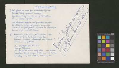 [pl-text: Utwór zapisany na II i III s. podwójnego folio.], [pl-text: Na I s. k.tyt. innego utworu: "[na ukos:] W dzień Bożego narodzenia | (partytura - format duży)".], [pl-text: Na IV i częściowo I s. tekst II i III zwrotki "Oj przeleciał ptaszek".], [pl-text: Pod nutami pieczęć okrągła z herbem Trzy korony, w otoku treść: "ARCHIWUM i BIBLIOTEKA | Krakowskiej Kapituły Katedralnej".]
