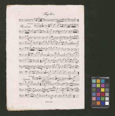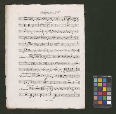 [pl-text: W górnym brzegu karty tytułowej wpisane numery: "15" , "113" (ołówkiem) i "518" (niebieskim długopisem, skreślony także niebieskim długopisem).], [pl-text: Na odwrocie karty tytułowej pieczęć: „ARCHIWUM I BIBLIOTEKA”, „Krakowskiej Kapituły Katedralnej” wraz z wpisaną ołówkiem sygnaturą. Pieczęć: „CATH. CRAC. * ARCH. CAPIT.” w partii org na str. 3, w każdej następnej partii na str. 1.], [pl-text: Na pierwszej stronie każdej partii (oprócz org) wpisana w górnym brzegu karty sygnatura ołówkiem. Na pierwszej str. głosu S ponadto niebieskim długopisem spisany numer "565".]
