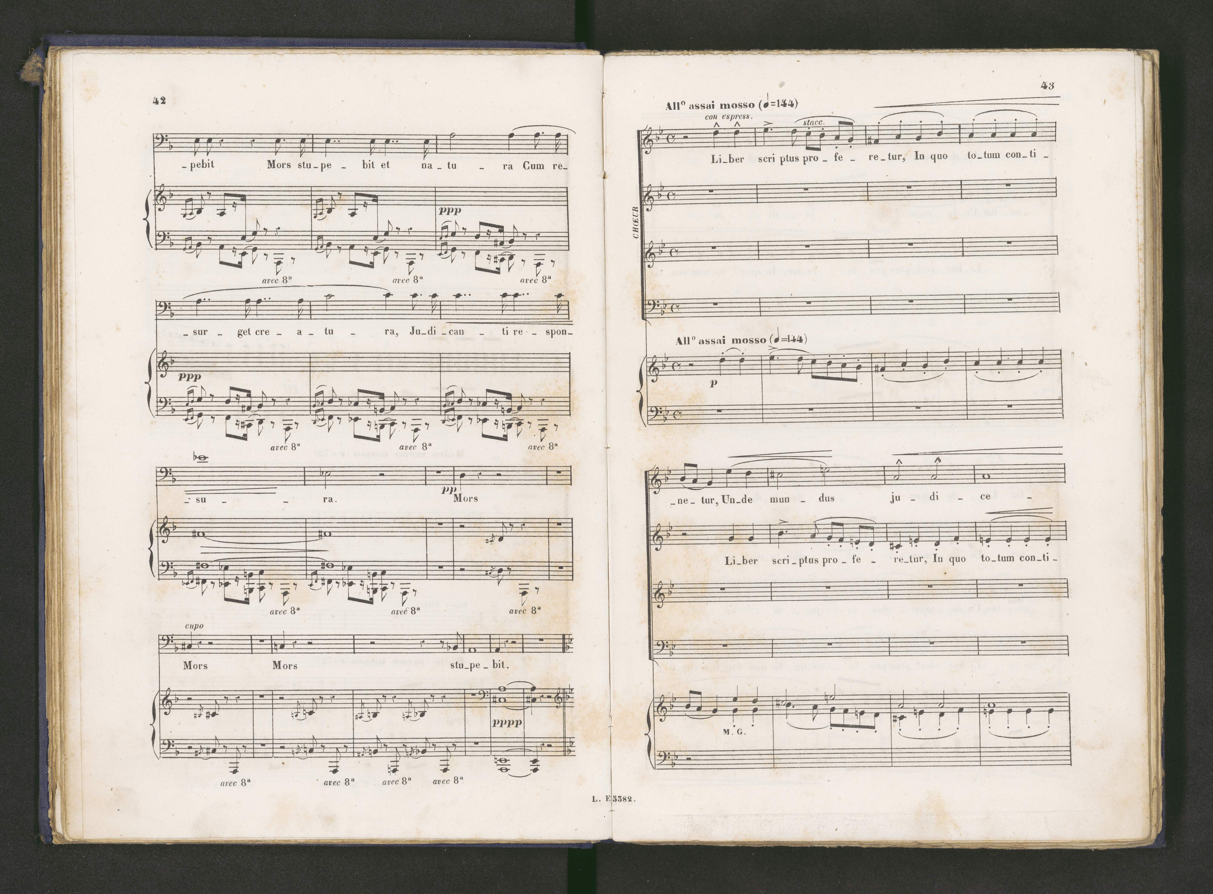 [on the tutle page:] Puor l'Annivèrsaire de la Mort | de | ALLESANDRO MANZONI | 22 Mai 1874 | Messe de Requiem | à Quatre Parties Principales | Soprano Mezzo Soprano Ténor Basse & Choeur | composée par | G. VERDI | Exécutée pour la Premierère Fois al'Anglise San Marco à Milan. | Réduction pour Chant & Piano par M. Saladino. | [...] | France & Etranger | Paris, Editeur Léon Escudier, R. de Choiseul, 21, | Dépôts à Londres, Bruxelles Barcelone, Madrid