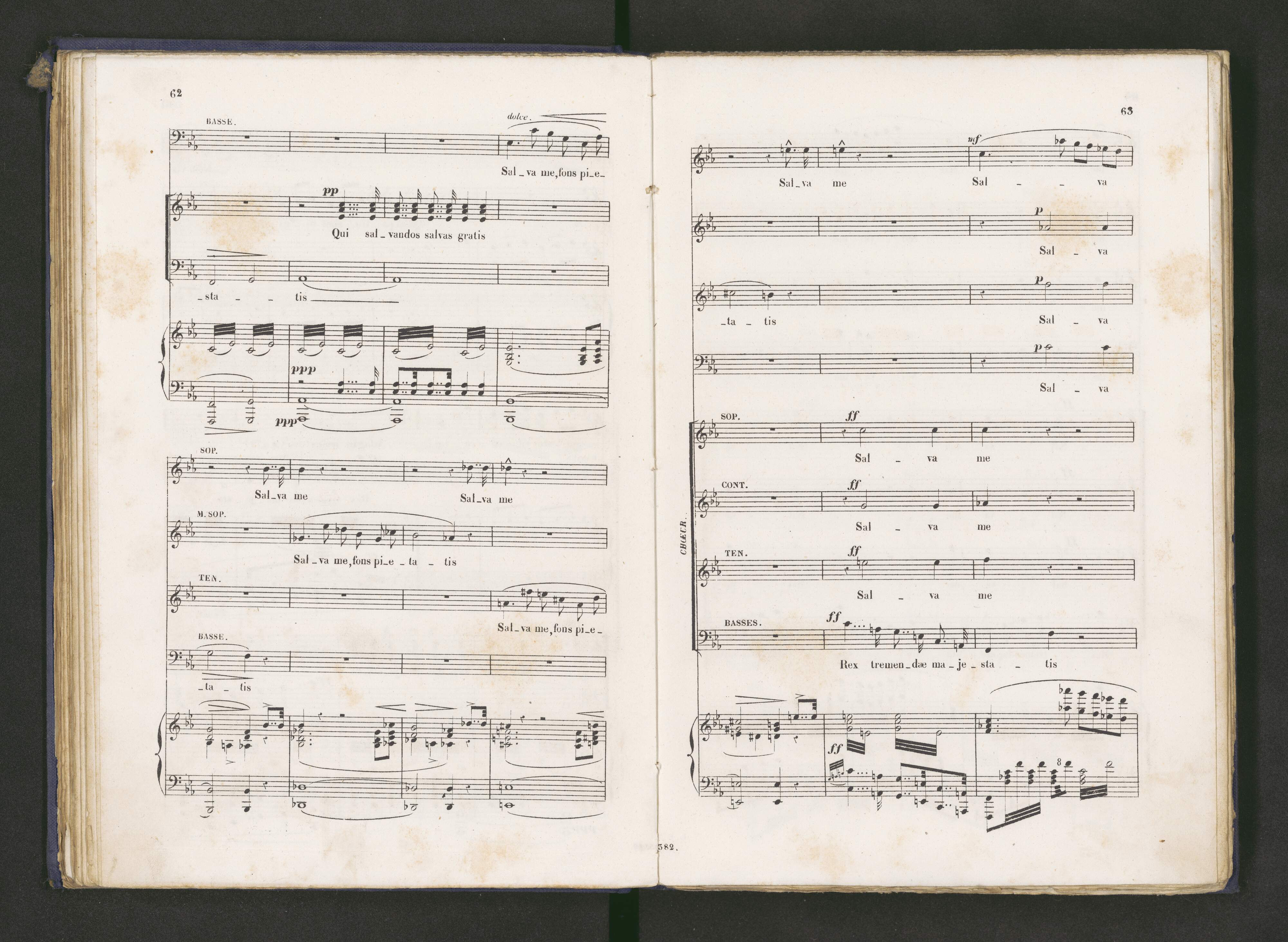 [on the tutle page:] Puor l'Annivèrsaire de la Mort | de | ALLESANDRO MANZONI | 22 Mai 1874 | Messe de Requiem | à Quatre Parties Principales | Soprano Mezzo Soprano Ténor Basse & Choeur | composée par | G. VERDI | Exécutée pour la Premierère Fois al'Anglise San Marco à Milan. | Réduction pour Chant & Piano par M. Saladino. | [...] | France & Etranger | Paris, Editeur Léon Escudier, R. de Choiseul, 21, | Dépôts à Londres, Bruxelles Barcelone, Madrid