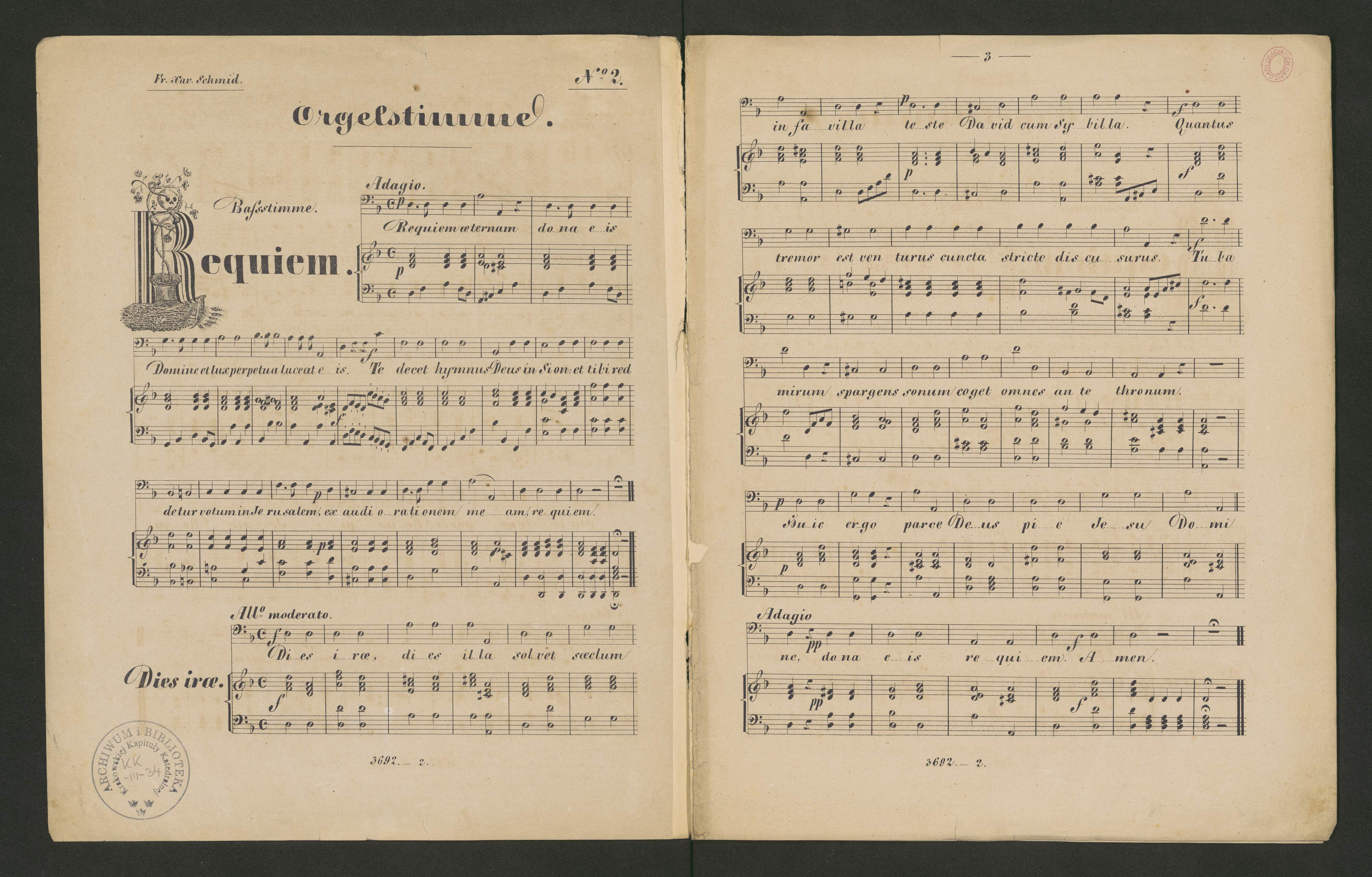 [directorium, title page:] Requiem | mit | 3 oder 4 Singstimmen und | ausgesetzter Orgel obligat, | 2 Violin, Violon, 2 Clarinetten, 2 Horn, | abwechselnd mit Trompeten nicht obligat. | Für | kleine Stadt- und Landchöre. | kurz und leicht componirt | von | Franz Xav. Schmid. | Op.2 | No. 2 in Dmoll | [...]